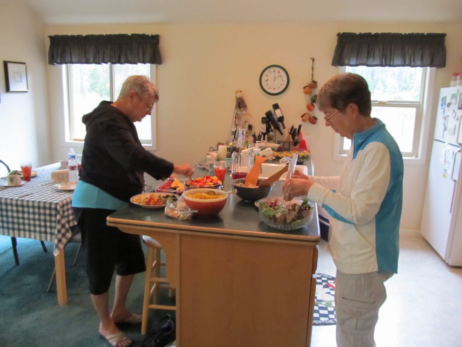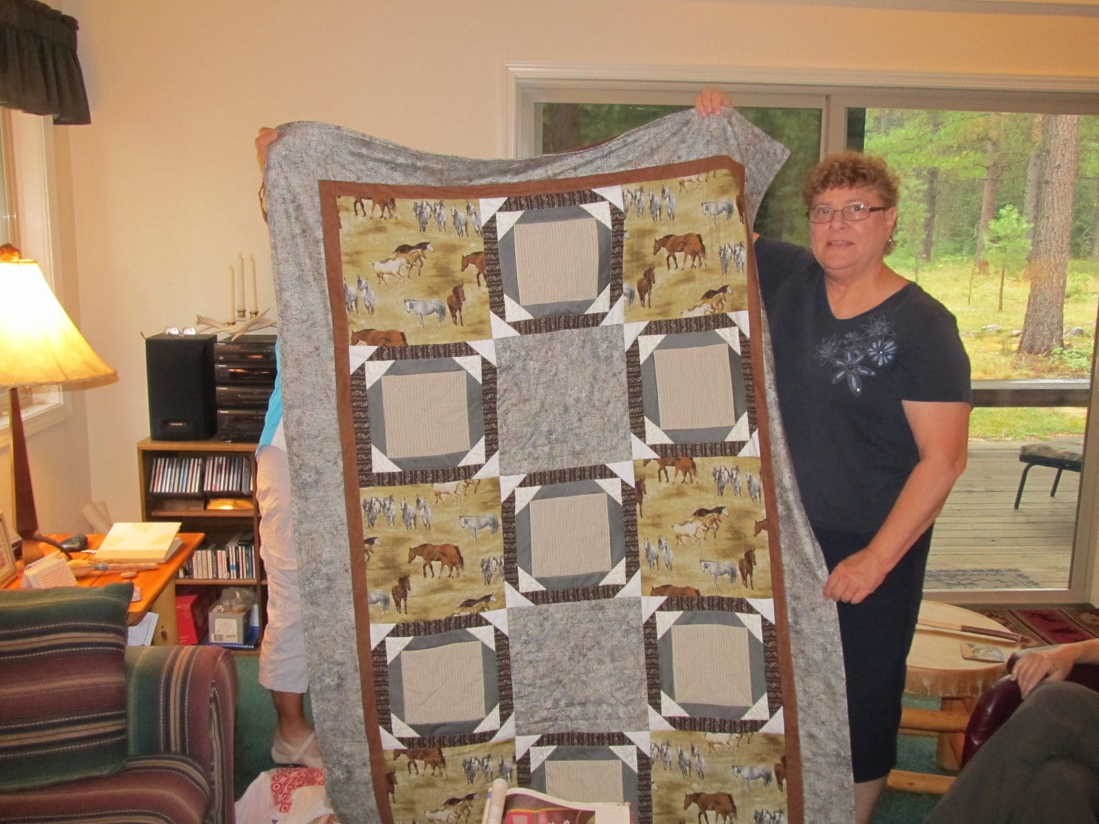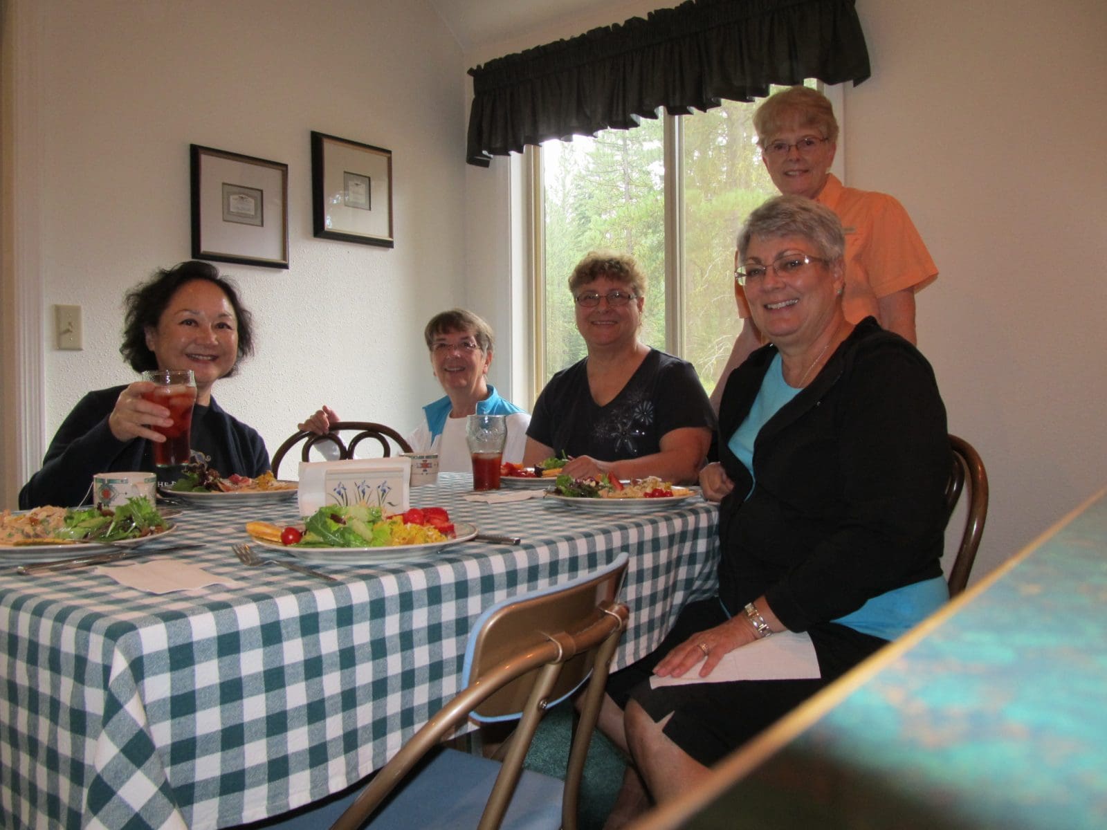 A bunch of Knotty Ladies escaped the valley smoke and spent the day at the Hedges cabin in Rocky Point on their annual quilting retreat. We enjoyed the refreshing rain and cooler temperatures as we reviewed our current projects and planned for the future. The retreat included hot coffee and muffins upon arrival and a delicious pot luck lunch.