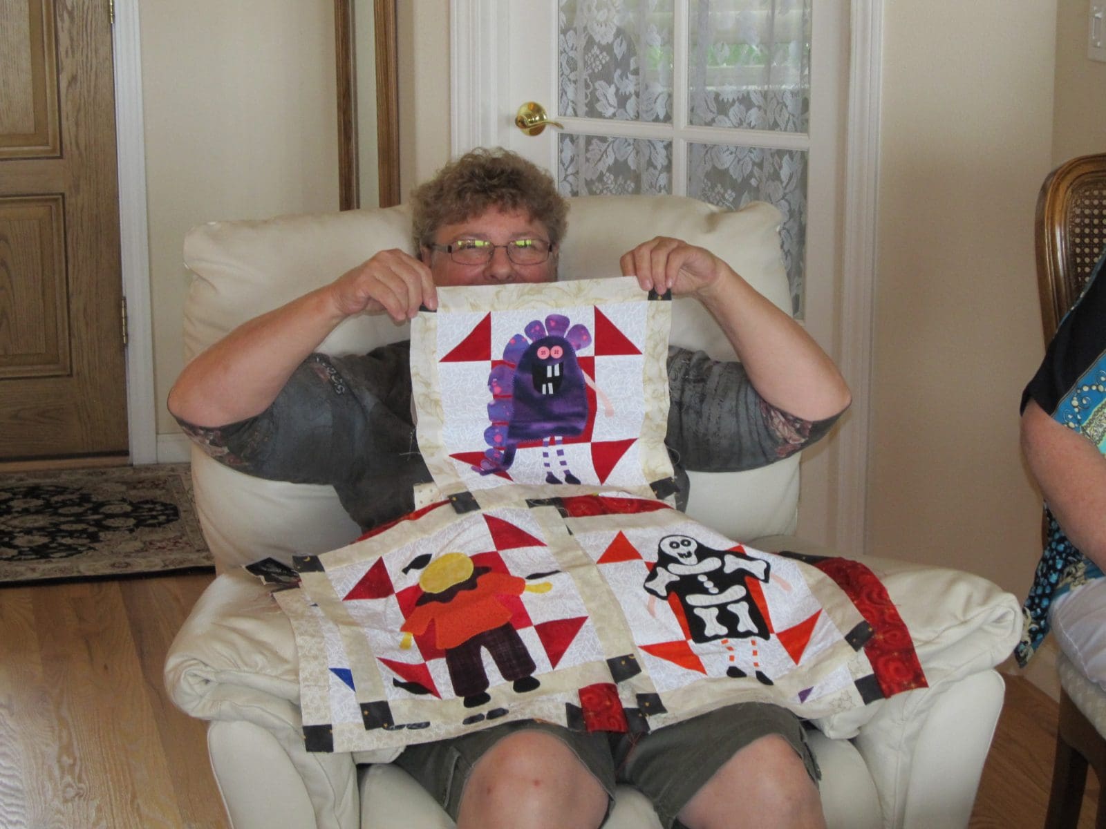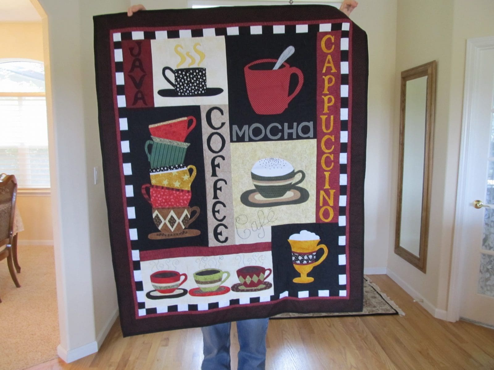 Future gift baskets were discussed. Members are not obligated to participate in the basket project, but we decided to begin collecting items for a coffee basket. Terry had made a coffe-themed lap quilt or wall hanging that she offered to donate to the coffee basket. We should all be on the look-out for a large basket for this project. Members are encouraged to continue to make baby quilts, quilts for wounded veterans, or any other items for charity.