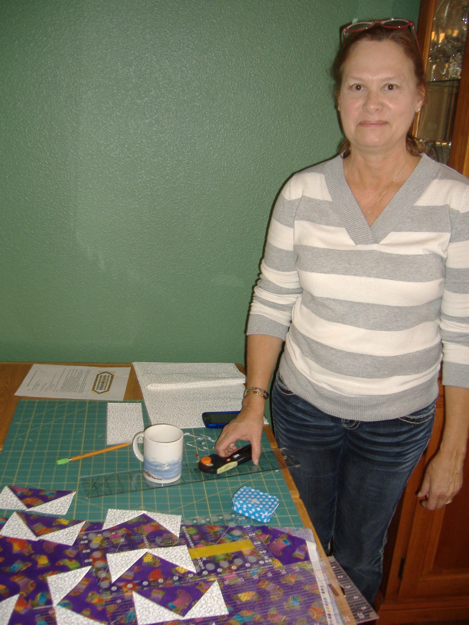 The Piecemakers met on Wednesday November 6 at Rosenelle’s to begin two table runner projects that used either friendship star or flying geese blocks. Rosenelle demonstrated a quick method for making flying geese blocks and before long the group began cutting fabric. Sewing machines hummed as people began piecing blocks. Around noon the group broke for a delicious lunch of chicken salad, croissants and baby carrots that Janet prepared. During lunch, we discussed business issues.