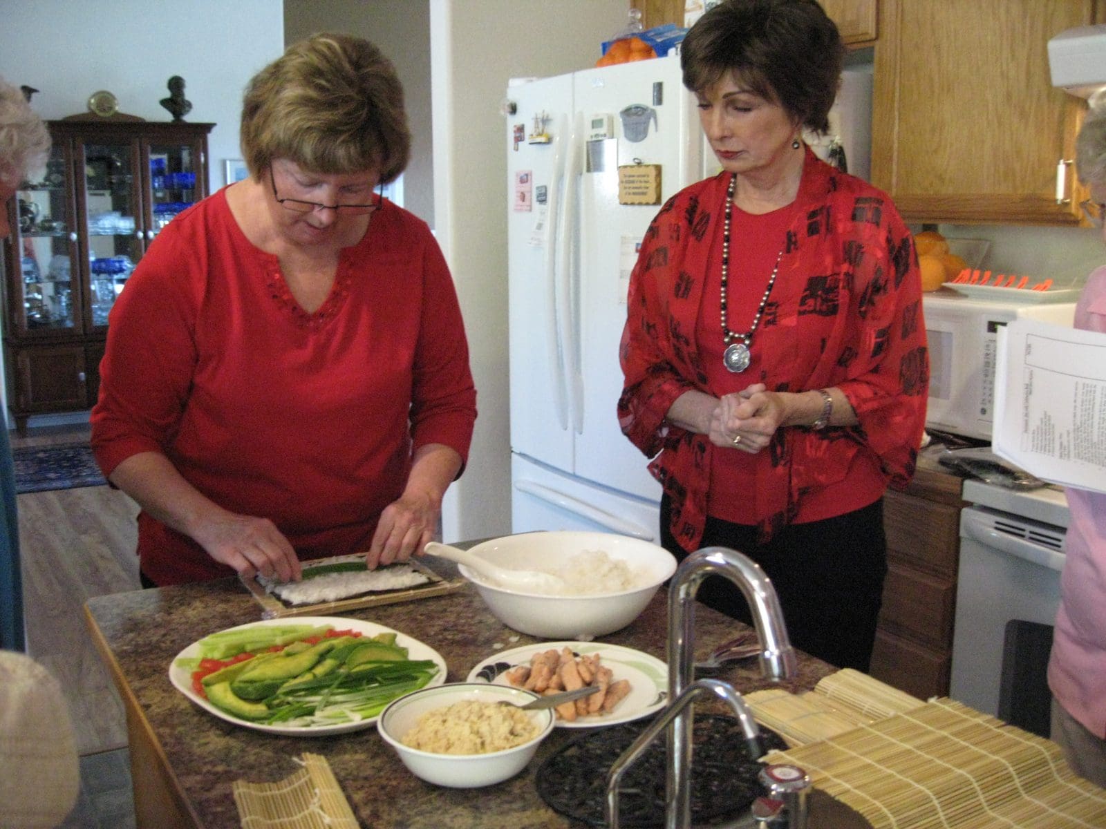 Betsy demonstrates the fine art of sushi making while Maureen Callaway is an attentive student.