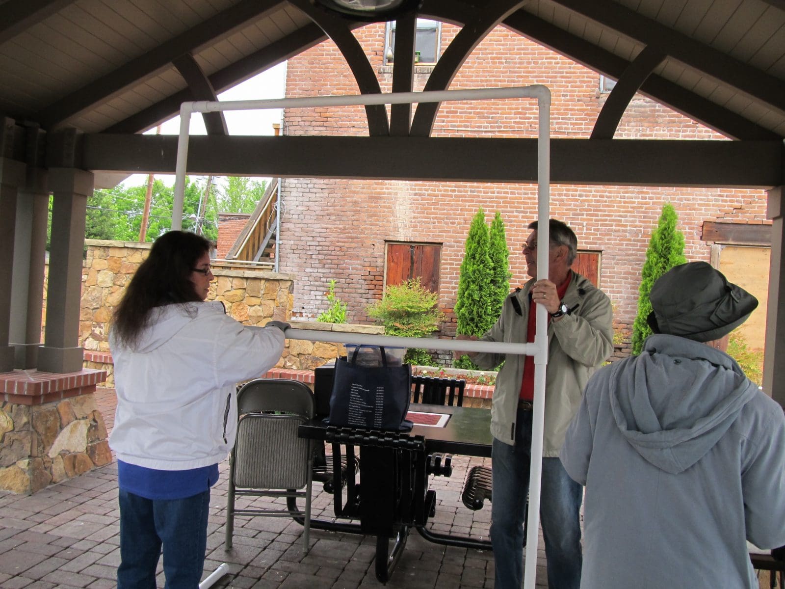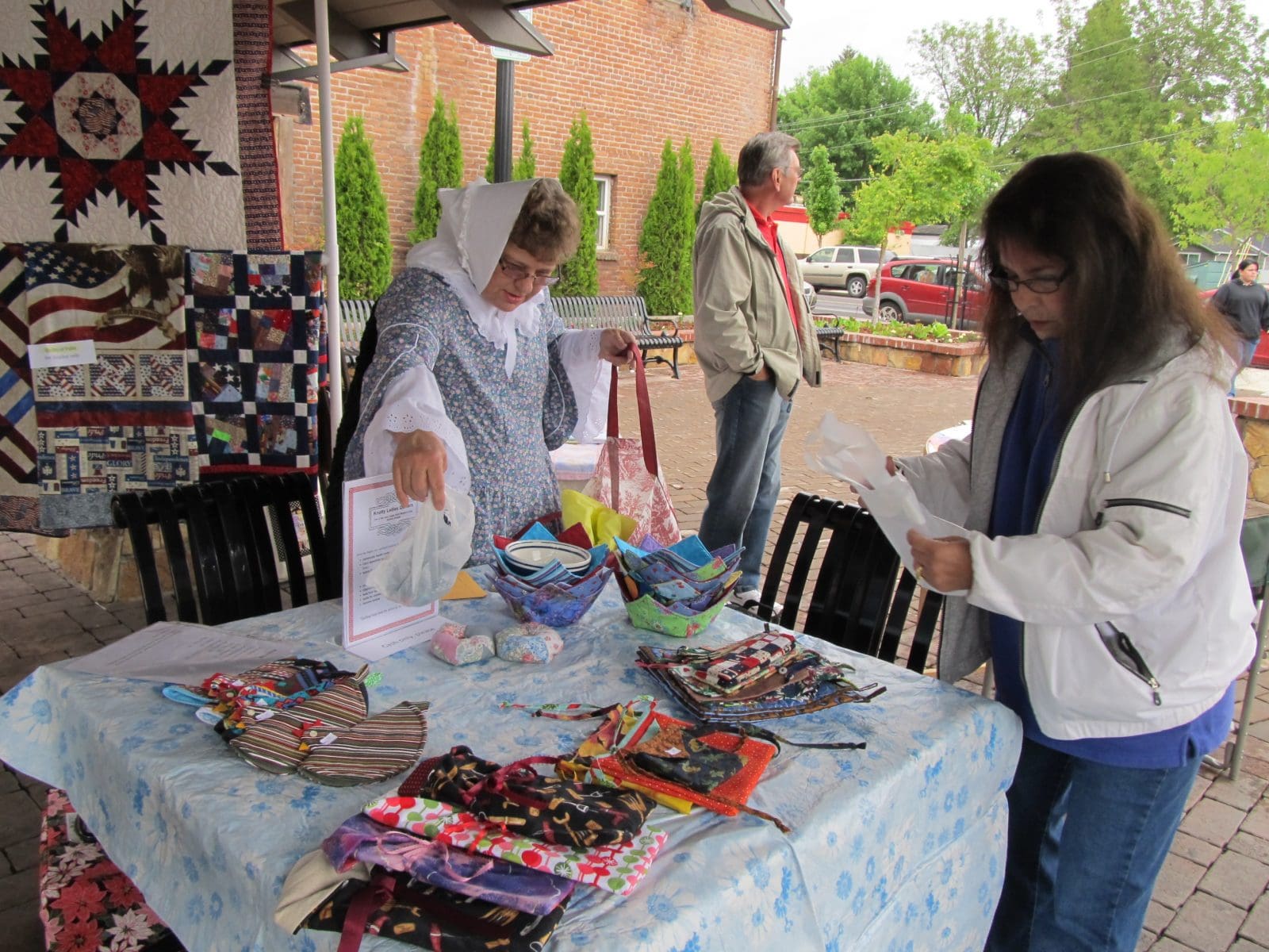 On Saturday, May 10, we braved the cold and the rain to join the Piecemakers under the roof at Centennial Park and show the community what fun it is to be a quilter. We displayed the quilts ready for donation as well as a variety of handmade items priced to sell.