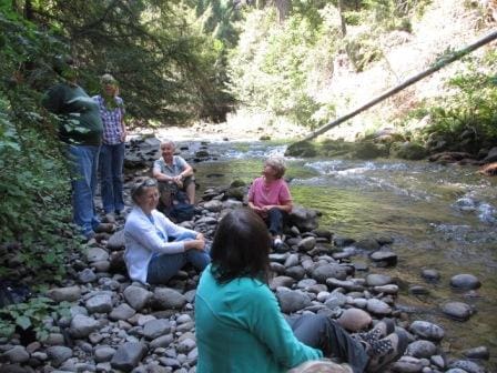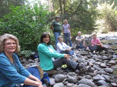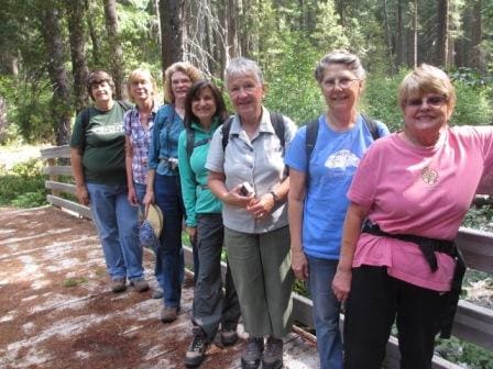 Eight hearty hikers enjoyed camaraderie Friday, Aug. 15 while hiking about 3.5 miles through old-growth forest of Douglas firs and sugarpines along the South Fork Rogue River. Oregon Grape, huckleberry, twinflower, and pathfinder plant formed a green carpet below the tall forest. The only obstacle was crossing a number of large downed logs across the trail. The rocky river was a perfect setting for our picnic lunch!