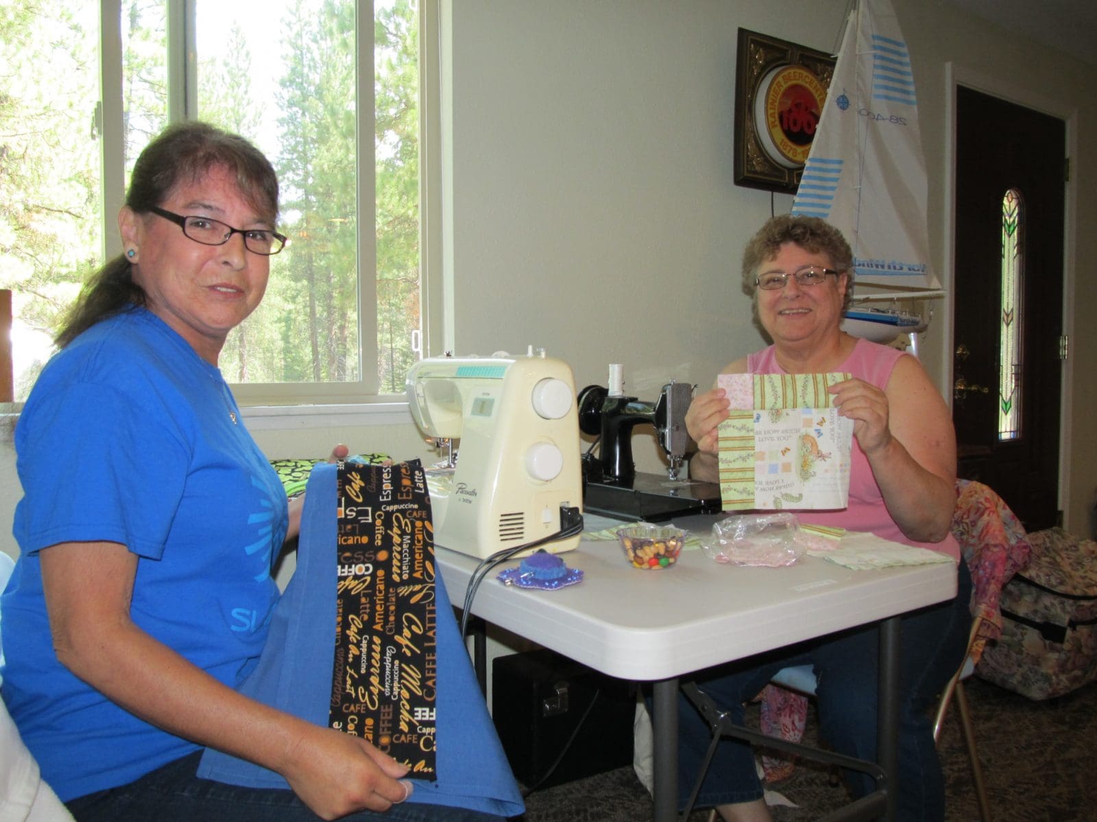 The Knotty Ladies attended their annual quilting retreat at the Hedges cabin on August 6. Dora gave a treasurer’s report stating that we are solvent. The quilt frame that Carol Kato and Bill constructed has been paid for. Several members displayed their fun show and tell projects. Bags of donated fabric and batting as well as a collection of quilt magazines were laid out for the members to take whatever appealed to them.
