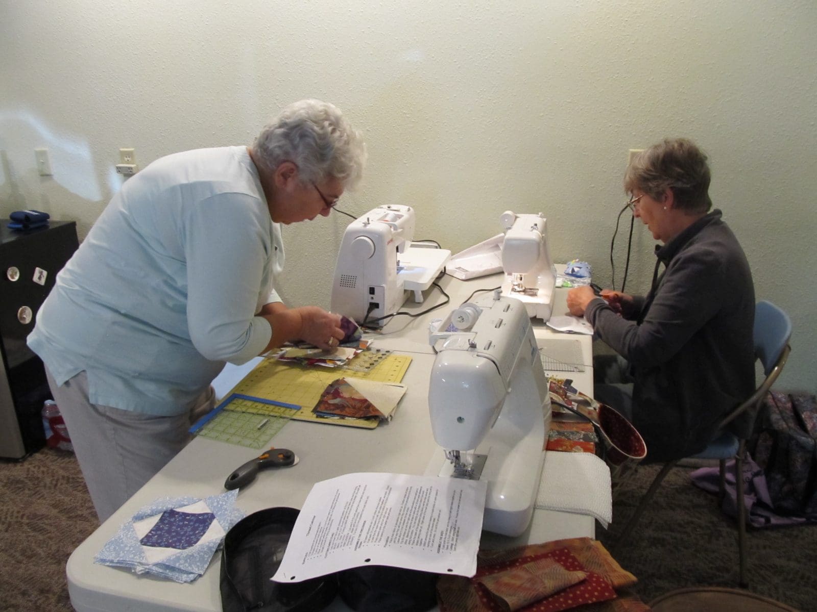 After the business meeting, Linda demonstrated how to make a simple “exploding” quilt block. Everyone made several of these blocks and Linda offered to put them together for a baby quilt. Then all the quilters worked on projects of their own. Pot luck lunch was well received, but the highlight was a fresh peach pie made especially for the Knotty Ladies by Bill Harrison. Everyone went away happy.