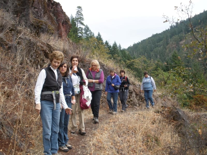Although the weather was a bit overcast with some intermittent raindrops eight hikers took on the Rogue River Trail. First hike of the season where we could feel “Fall” in the air. We hiked east under the Lewis Bridge following the trail just above the Rogue River for approximately three miles. We crossed a very scenic bridge with a lovely creek and enjoyed the viewing benches on the trail that overlooked the river. After our hike we stopped in Shady Cove and ate at Max’s Diner at their new location along the river – great atmosphere and the food was good too!