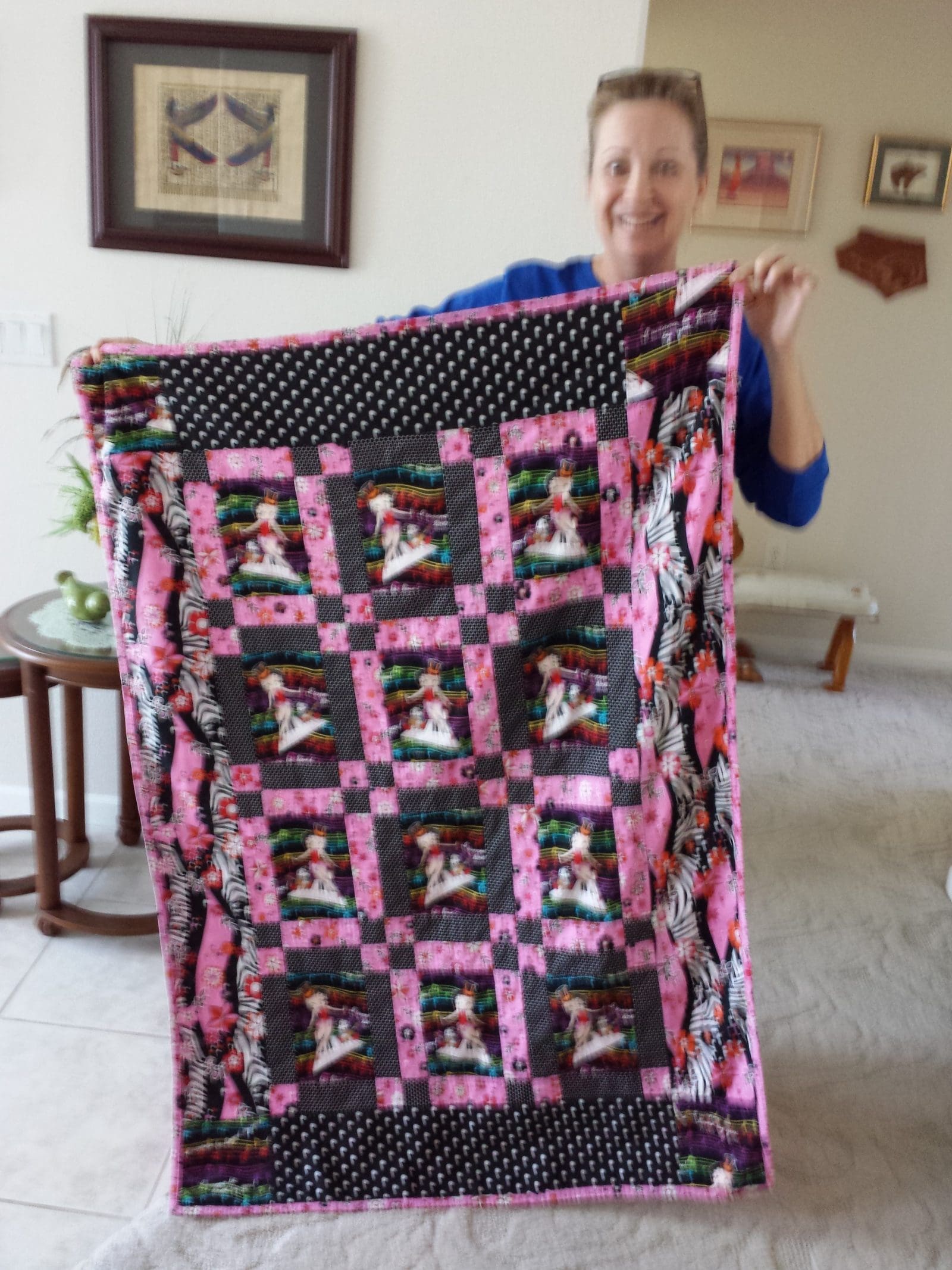Show and tell featured two beautiful quilts by guest Robin and a charming Betty Boop quilt by guest Linda. Meridel shared the tee shirts she had designed using artwork from her granddaughter.