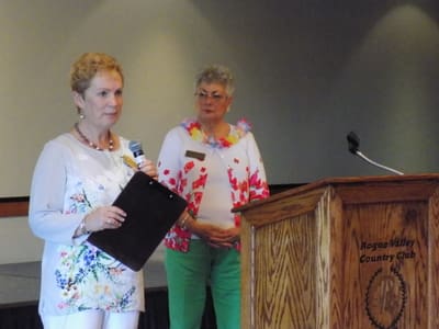 Fifty Club members gathered at The Rogue valley Country Club for a Hawaiian-themed luncheon and another excellent program. Dyan Straughan, geneticist with the Animal Forensics Lab in Ashland, provided an interesting history on the formation of the lab followed by a description and pictures of the diverse “detective” work performed there. The lab in Ashland is the only one of it’s kind in the world. The Board election results were announced by the nomination committee of Sharyn Close and Elaine Slate. The table decorations were hand-crafted by Annette Godfrey, luncheon coordinator, and added a touch of aloha to the room. The new Board will be: