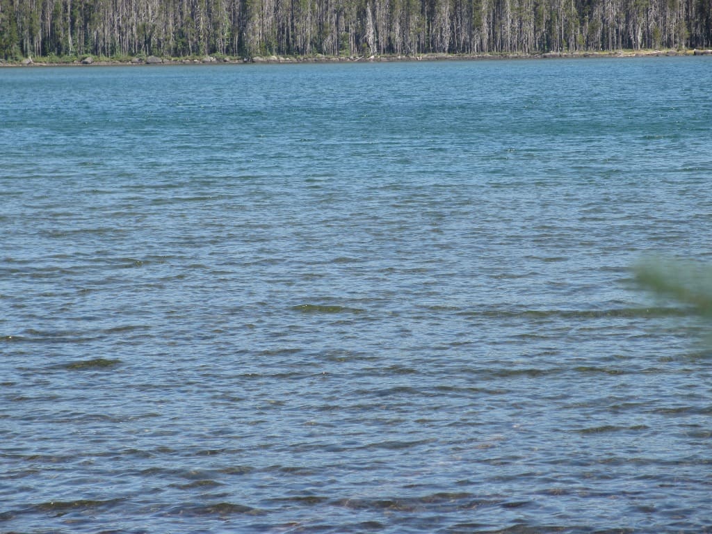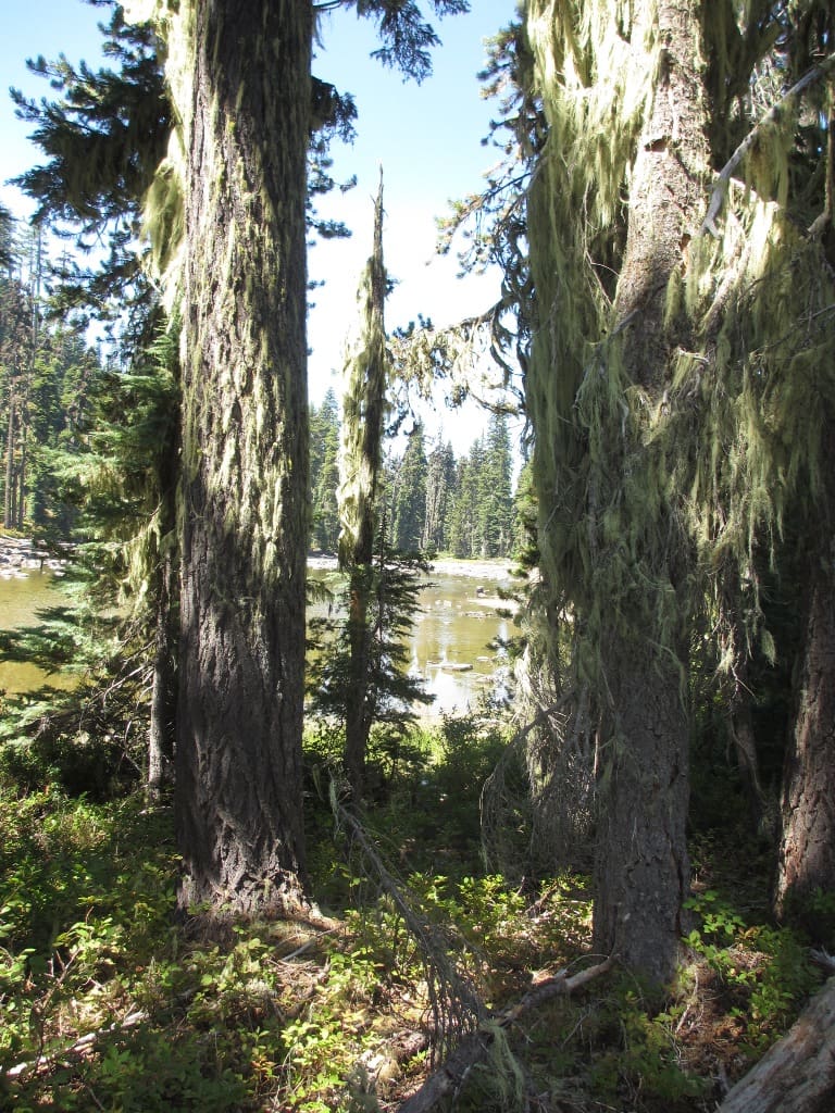 Eight members of the hiking group escaped smoke in the valley and found clear blue skies at Fourmile Lake on August 21, 2015. They hiked six miles round trip through a forest of lodgepole pines and huckleberry bushes. Highlights were picnicking at beautiful Squaw Lake, hiking to the PCT, and observing the mossy trees near another small lake.