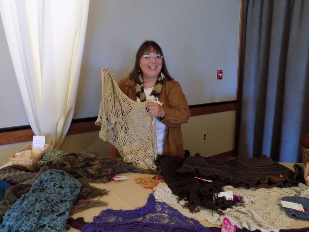 Connie Quiring with her beautiful crocheted shawls, scarves and hats.