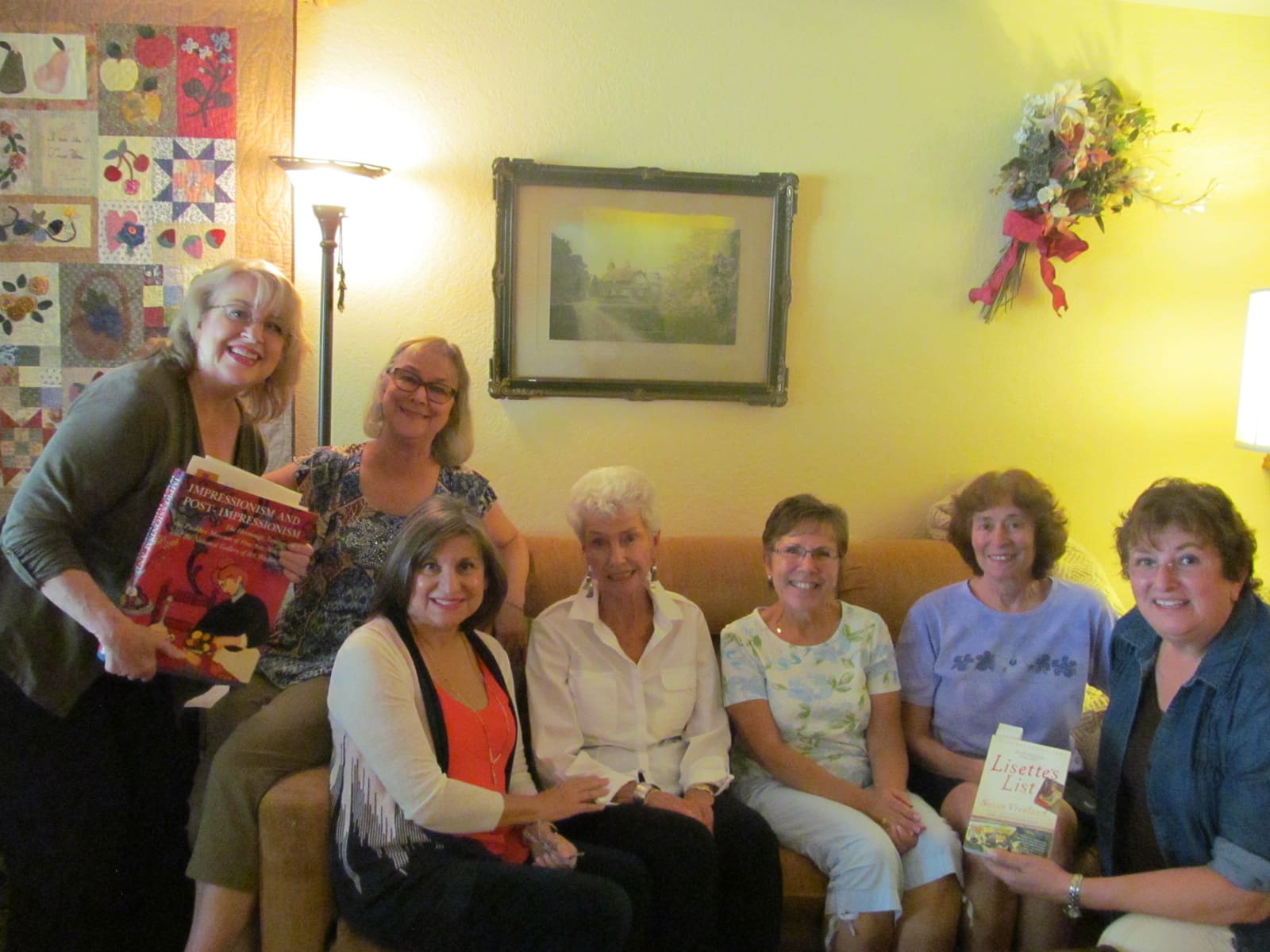 On a warm September afternoon, eight women gathered at Lynn Leissler’s home to discuss Lizette’s List by Susan Vreeland. The author weaves a tale of art, love, and war, set in Provence, France during WWII. Instead of overpowering, the war provides a menacing backdrop for this richly themed story. Lizette is barely in her twenties when she and her new husband, André, leave Paris to care for his sick grandfather in Roussillon. Gran-père Pascal owns seven paintings by Pissarro, Cézanne, and Picasso, and Lizette later meets Marc and Bella Chagall. Vreeland weaves her themes throughout the story: light in descriptions of scenery, a home’s interior, art; color through art and the vivid, nearby ocher mines; lists that include her list of Hungers and Vows; love and loss when her beloved André dies, and the possibility of new love. Circumstances force Lizette to remain in Roussillon, where she must grow up and provide for herself. A rich tale, intriguing and well told. Lynn served food in line with the novel and its setting—French apple cake, chèvre on rosemary/olive oil crackers with apricot jam, olives and grapes and crème café. Another book club member brought samples of ocher paint, books about the depicted artists, and some of her own work.
