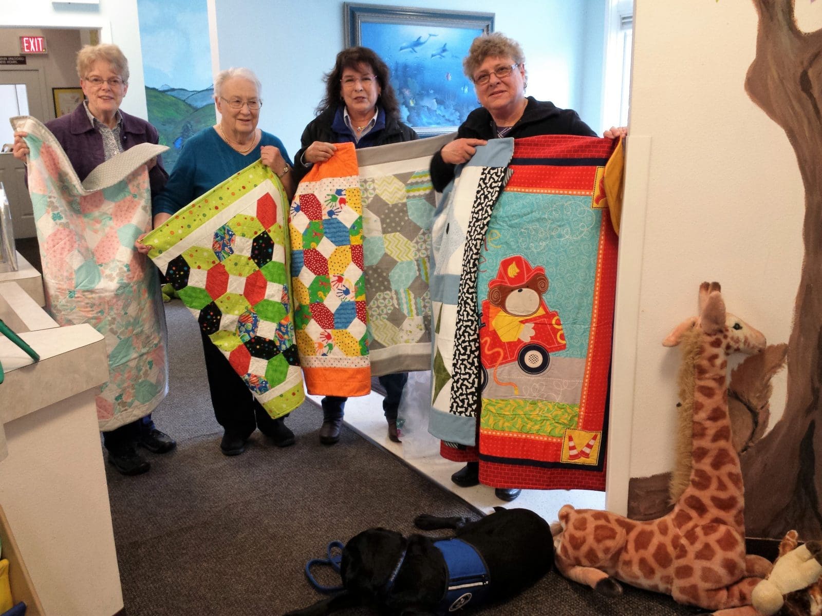 Arrangements were made to deliver the stack of donation quilts. On Friday, February 3, Lydia led the delivery party (Carol Kuehnert, Dora, and Meridel). The Children's Advocacy Center received six children's quilts and the Veteran's Administration in White City received a bed quilt and a lap robe.