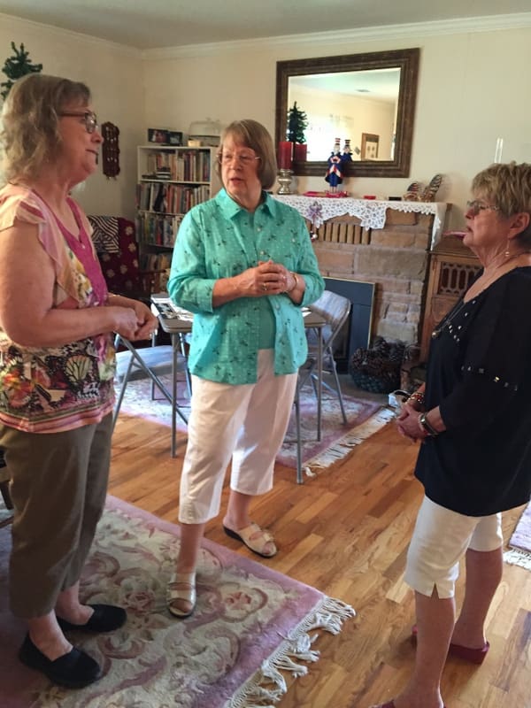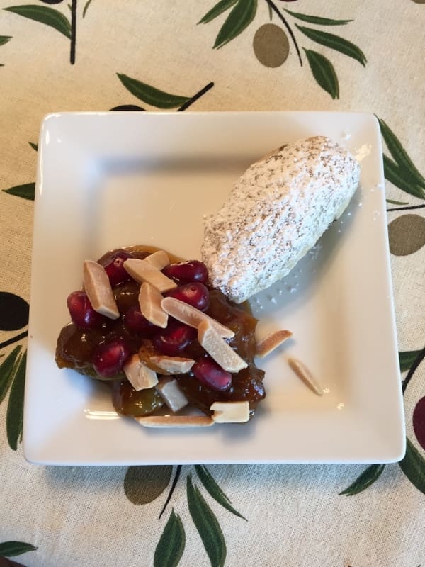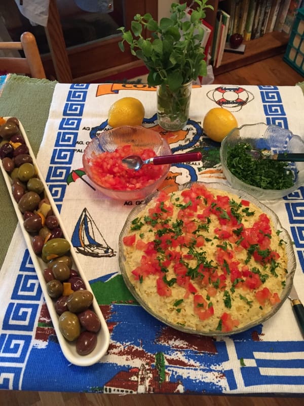 On a rainy summer day, the Culinary Arts group gathered at the home of Maxine Williams to discuss and sample a variety of recipes from the cookbook: "How to Roast a Lamb: New Greek Classic Cooking" authored by Michael Psilakis. Michael creates his recipes utilizing as many fresh ingredients as are available producing dishes which were much lighter and healthier than many expected. Finding pomegranate seeds in June proved to be the biggest ingredient challenge. As always, enjoyable food and company and the experience of new foods.