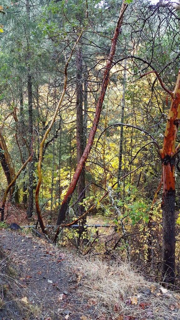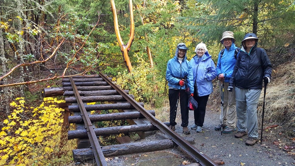 Rain didn't stop five of us from hiking last Friday, Oct. 20 at Forest Park. We began on a moderate steady climb on the Siskiyou Trail and completed the loop on the Rail Trail, where we viewed a replica railroad trestle at the site of the 1916 train wreck. Even though the rain didn't let up until we finished hiking 3.4 miles, the Fall colors were stunning and the madrones spectacular! We warmed up at lunch at La Fiesta in Jacksonville.