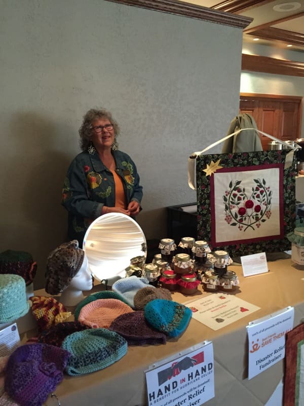 Bonnie Scriba and her table of items being sold for hurricane victims relief