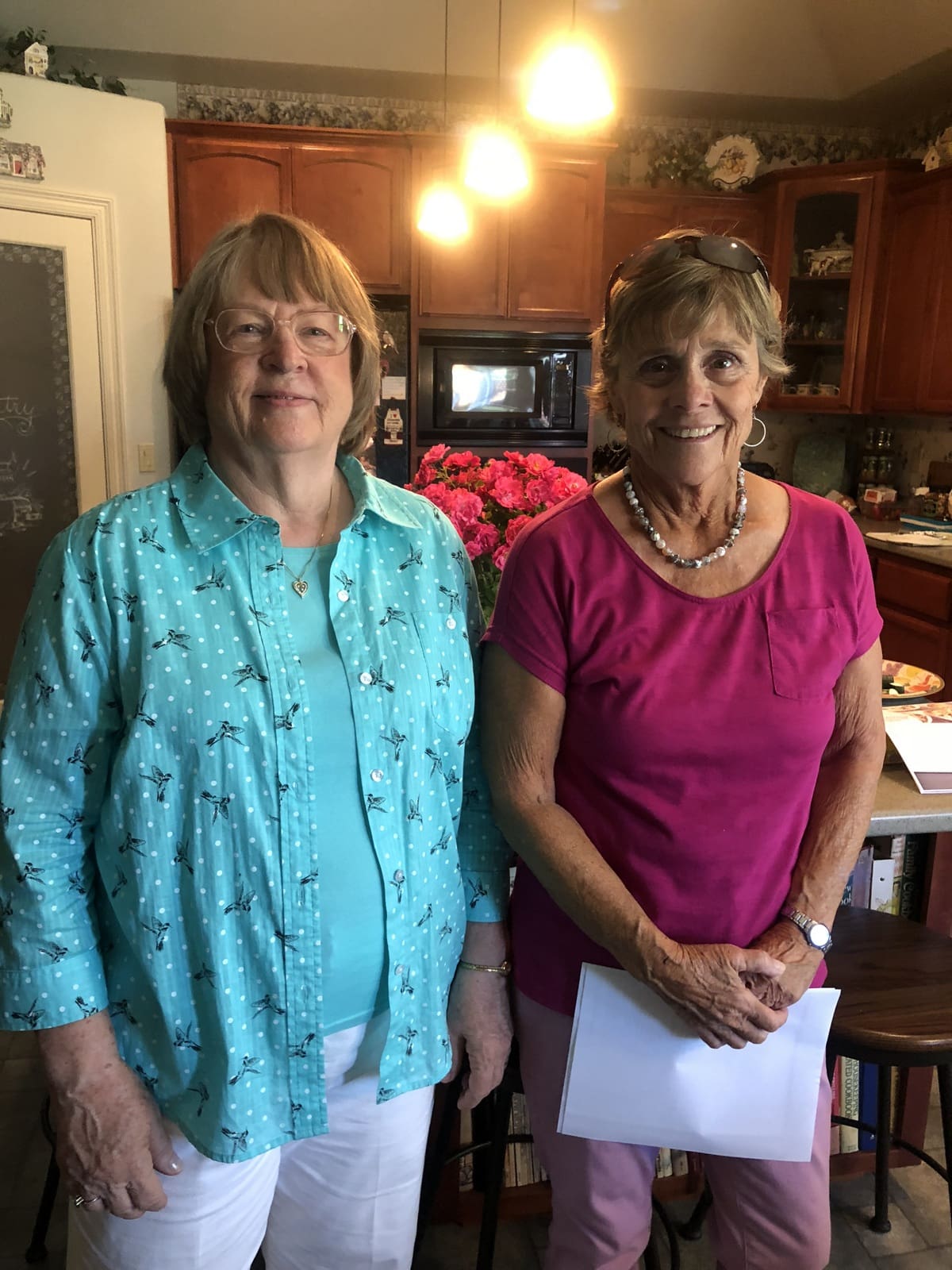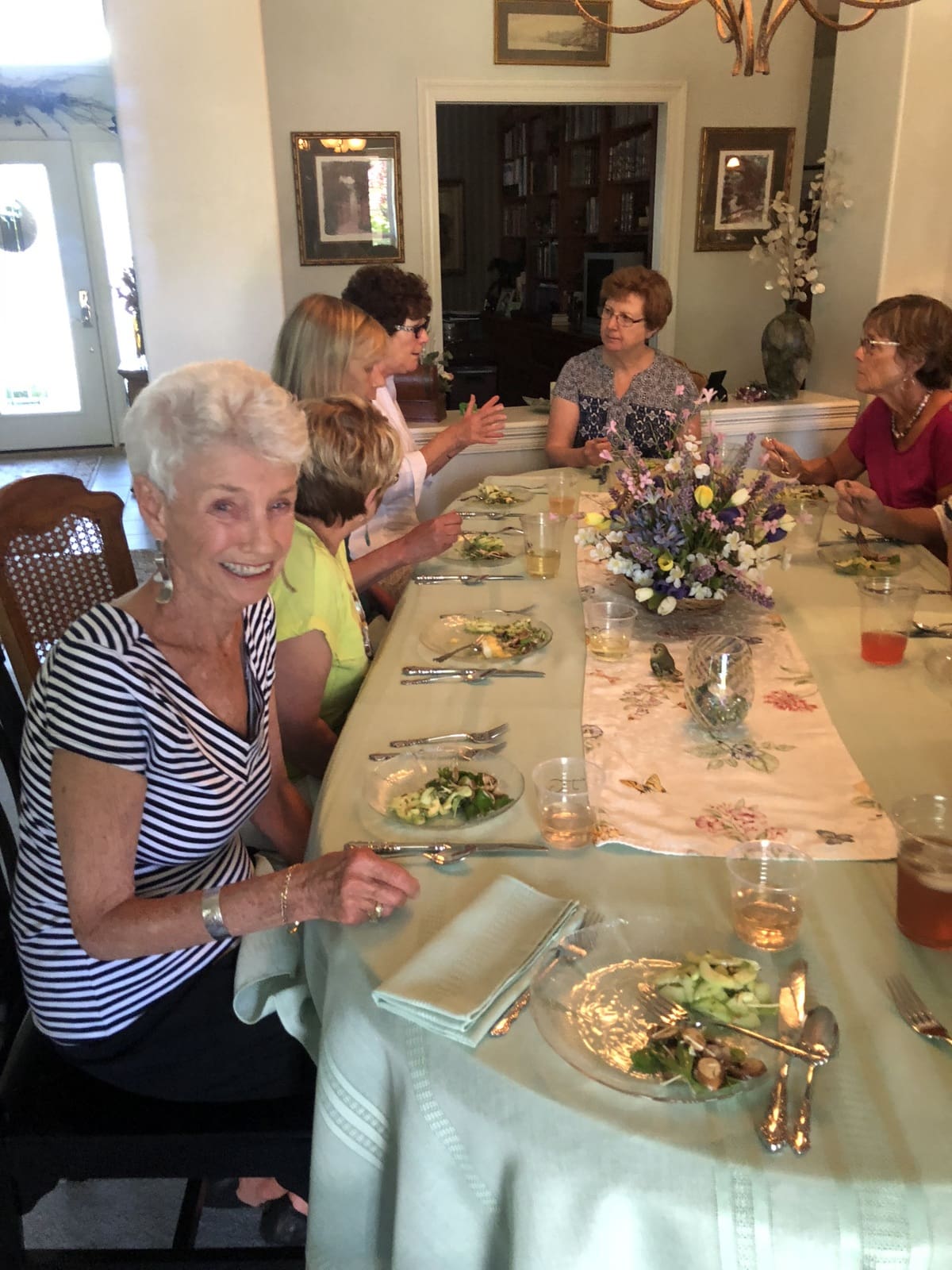 Eleven ladies met at the home of Janice Kabel to share foods prepared from recipes selected from "America's Test Kitchen: Just Add Sauce": cookbook. Co-hostesses Joan Devlin and Janice Kabel selected recipes to cover all meal courses from appetizers through desserts and each guest brought the dish that they had prepared at home from their assigned recipe to share. We enjoyed each course with a discussion of how each dish was prepared and any special details involved. Several of us dusted off fondue pots that had been stored for years to serve southwest cheese fondue and chocolate fondue with cognac. Every dish was delicious and savored with a few sips of dry white or rose' wine or iced tea. Conversation was enjoyable and shared around a beautiful table set by Janice. Thanks to Joan and Janice for all of the effort put into this event. Looking forward to "Cooking with Fresh Food" in August.