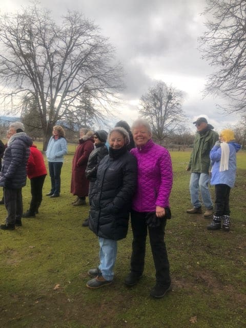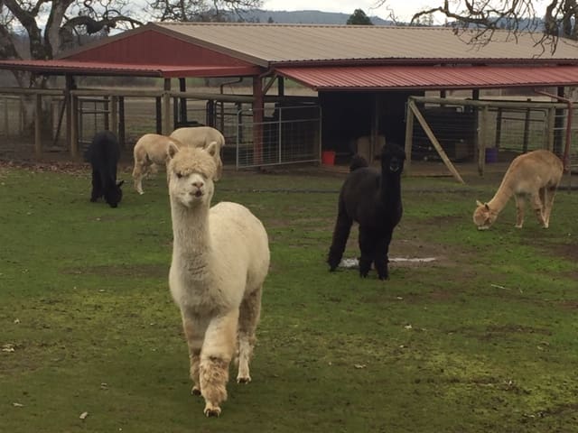 Well, we woke up to snow on February 5th but that did not stop 14 ladies from heading out to tour Renate and Richard's Alpaca ranch. We dressed warm, wore boots and had a great time. The alpacas were so fun to watch and listening to Renate & Richard talk about the operation was fascinating. It is all about their fiber! The tour included shopping in their gift shop. You get to see what they do with the fiber. Amazing! After the tour we headed to Shady Cove to enjoy great food and beautiful views of the Rogue River.