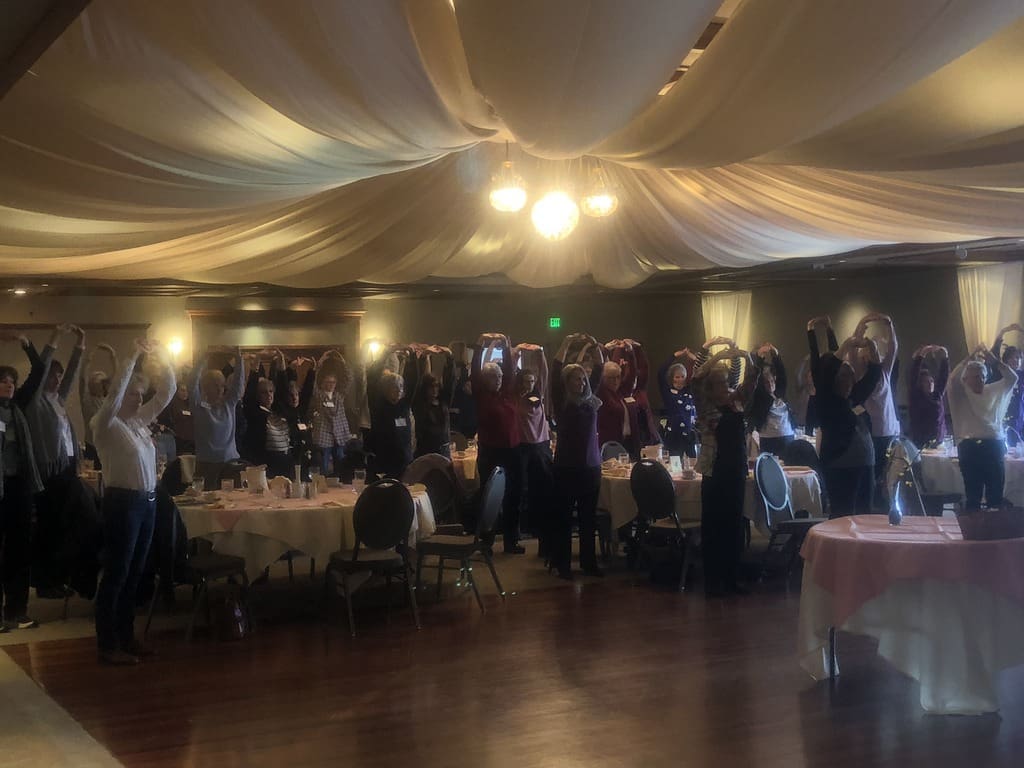 71 eager members and guests filled the ballroom at Rogue Valley Country Club on Feb. 20 for some great socializing, updating, learning and eating. Our featured presenter was Susan Sky, licensed acupuncturist and ancient Chinese medicine visiting. Suzanne provided information on health, overall wellness and then demonstrated and led us in practicing some Qigong exercises. Everyone enthusiastically participated in the practice and felt relaxed and more balanced at the conclusion. The Board provided reports on Club business and we welcomed guests and new members. A tasty buffet lunch featuring pesto chicken, roasted vegetables, fresh fruit, salad bar and rolls was enjoyed while visiting with our tablemates. A piece of apple pie completed the satisfying meal. We all celebrated the birthdays of members born in January and February. The beautiful table decorations created by Maxine Williams were distributed through a name drawing. Another great EPWC event.