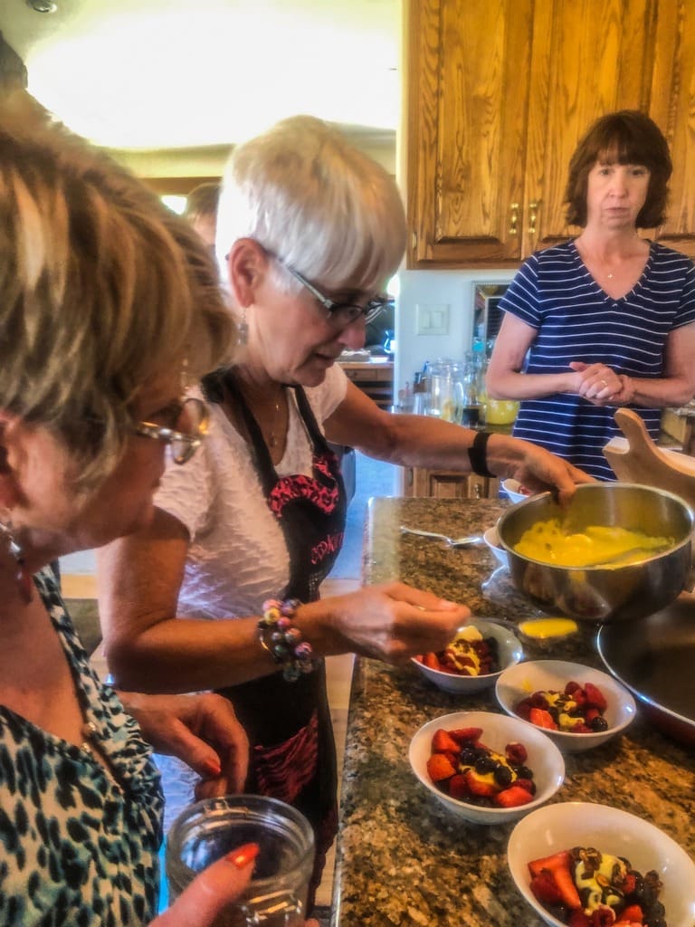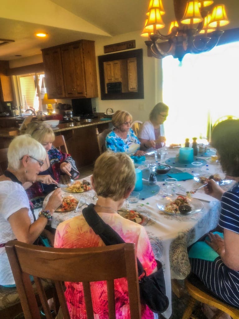 This was the first time that Culinary Arts hosted a lunch at two different homes to accomodate our growing group numbers. The menu was identical at each lunch and eleven people attended at each home. Janice Kabel and Jackie O’Neil co-hosted at Janice’s home and Viki Brown and Linda Haynsworth-Kruger co-hosted at Viki’s home. Several cookbooks were used with “Dishing up Oregon- Celebrating Farm-to Table Flavors” by Ashley Gartland being the primary one. The dishes ranged from shrimp and white bean salad with cilantro vinaigrette, albacore tuna ragout with zucchini noodles to fresh berries with tequila-lime espuma. Each dish was delicious and on the light side, so nobody felt compelled to skip dessert. Each cook described her dish and commented on any recommended preparation tips as we sampled the food. We welcomed a new member, Elaine Sands, who joined the group for the first time and prepared wonderful feta and swiss chard stuffed lamb meatballs. Thanks to the hosts and to the cooks for another great event.