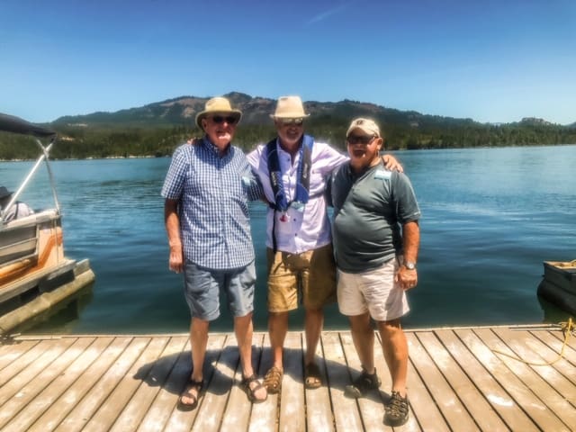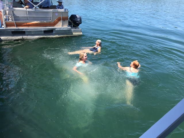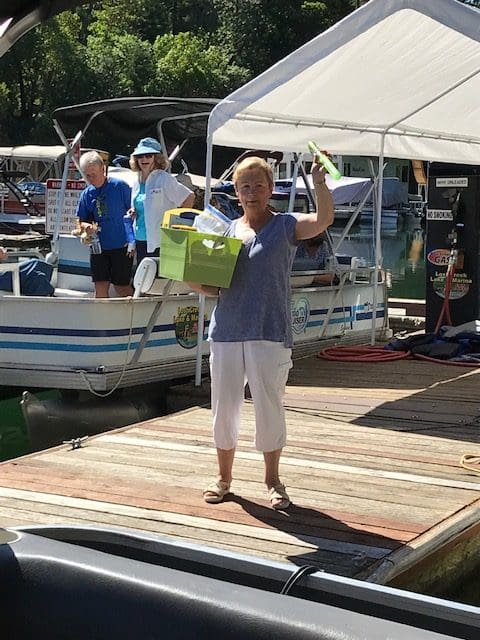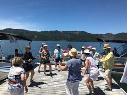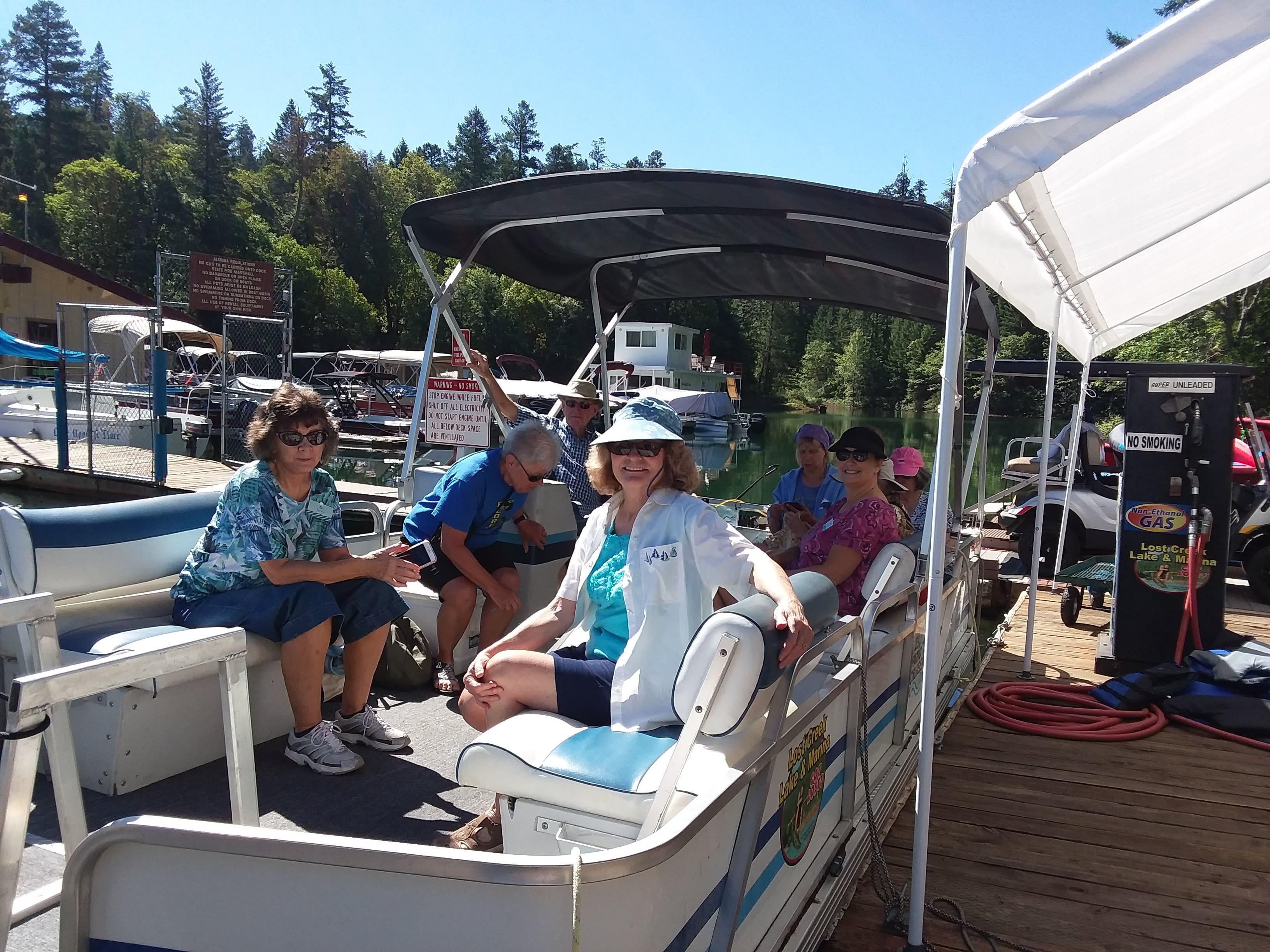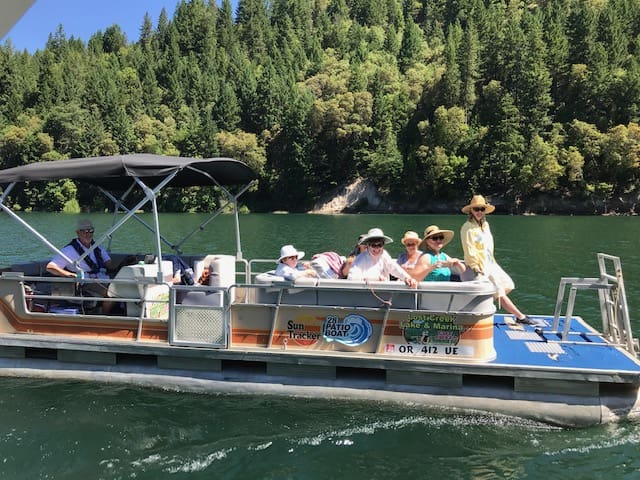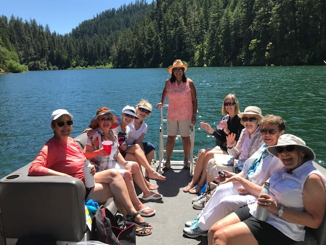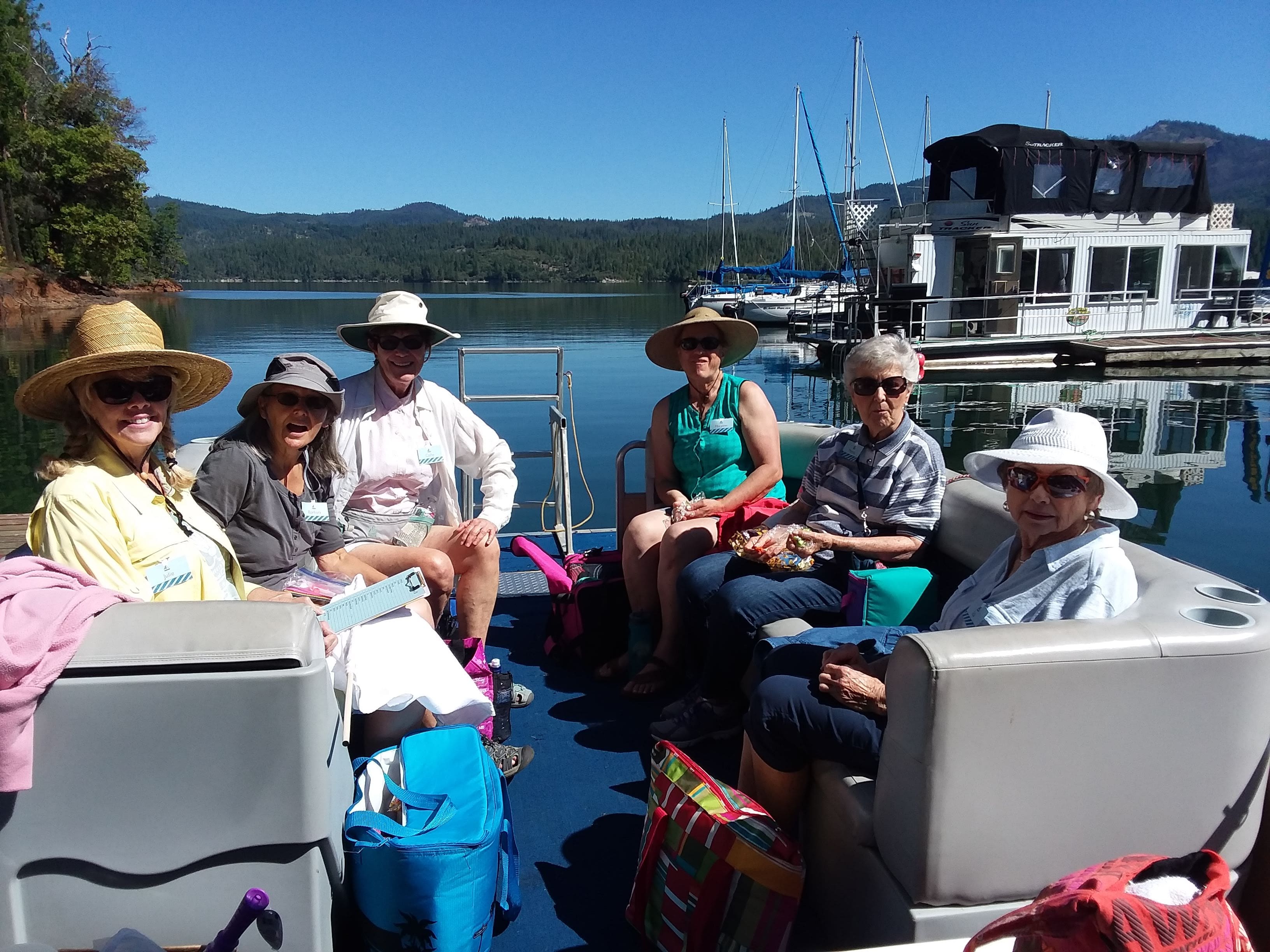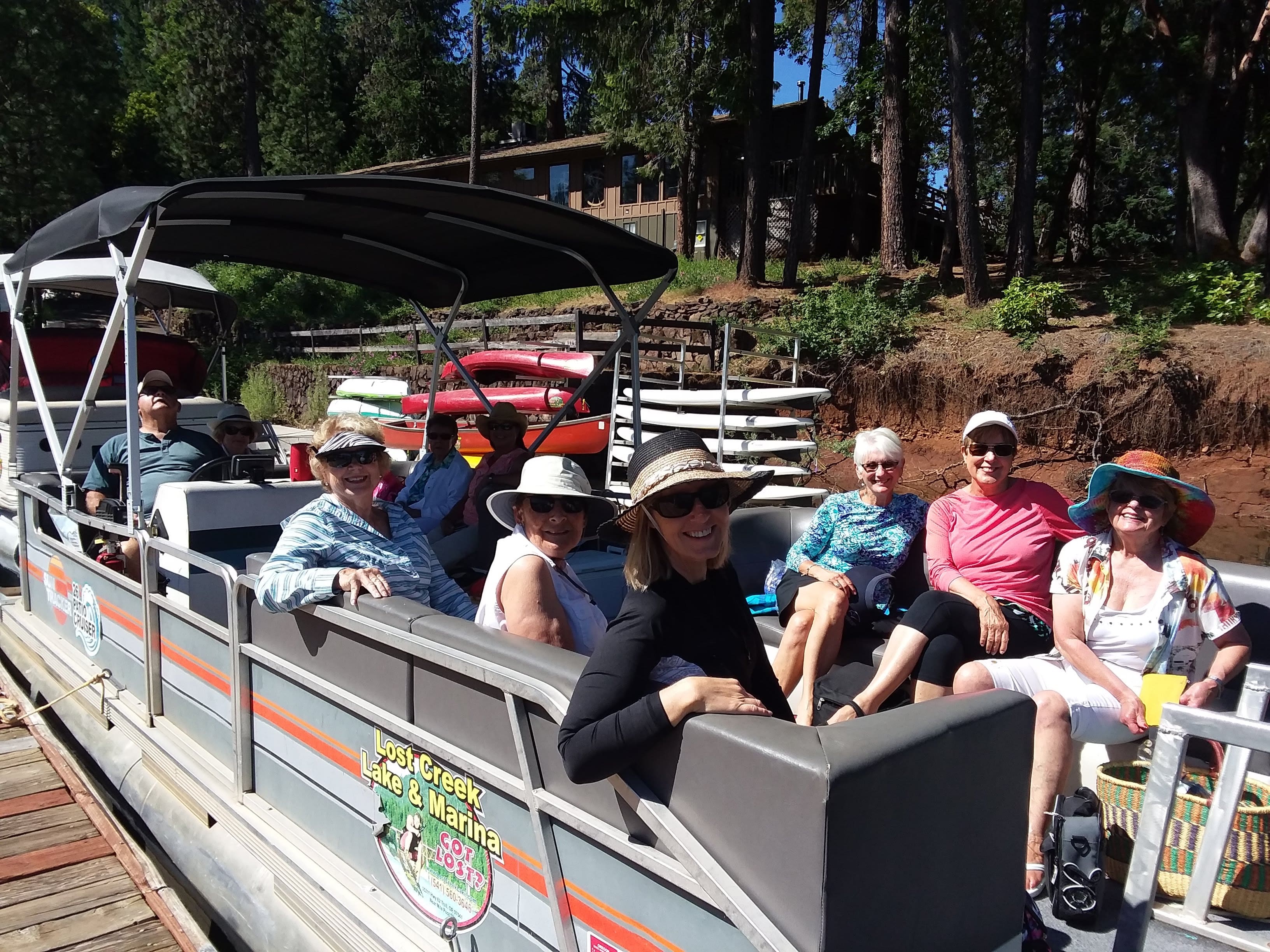 On June 4th, 23 ladies and 3 of their husbands had a fantastic outing on 3 patio boats cruising around Lost Creek Lake. It was one for the records. The weather was absolutely perfect. But this was not just a boat cruise. Our planner extraordinaire, Annette Godfrey, had goodie bags for all of us and planned 3 games. Each boat competed in three events, a scavenger hunt, writing a song to depict our boat/crew, and design a flag for our boat! Each boat won an event so prizes were provided to all. Then there was the swimming and dancing at the swim dock. A huge thank you to the volunteer boat drivers, Don Brown, Lonnie Lawson and Dennis Godfrey. They were also the judges in the flag and song competition. Some of us brought our lunch and others ordered delicious sandwiches from the Picnic Basket Deli in Shady Cove.