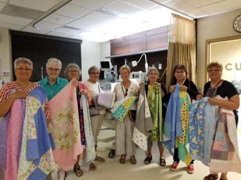 The Knotty Ladies recently took a field trip to the Neonatal Intensive Care Unit (NICU) at Asante Rogue Regional Medical Center. EPWC’s own Annette Godfrey, a registered nurse who works in that unit, led the tour which included an in-depth look at the amazing equipment used in transporting and caring for these tiny babies. Annette is also licensed as a transport nurse who rides in the helicopter when a baby in trouble needs specialized care that is not available from its own hospital. At the end of the tour the Knotty Ladies donated 29 handmade receiving blankets and one baby quilt. Thank you, Annette, for your service to this community and to the outlying communities who connect to our hospital. It was an inspiring day.