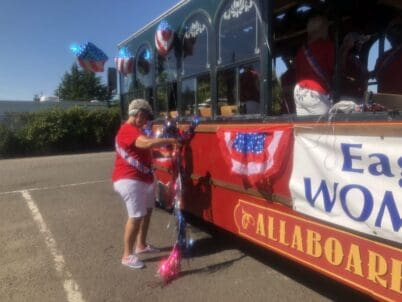 17 EPWC members decorated the All Around Town Trolley in bright, patriotic colors and then hopped on board to play loud and proud kazoo music all along the Eagle Point 4th of July parade route. It was lots of fun, a beautiful day and a large crowd lining the streets to cheer us all on. We won a first prize (I think) for "Best Decorated Vehicle" and third prize for a musical entry. Thanks to Sharyn Close who secured the trolley for us and coordinated the decorating effort. Thanks to all the other members who participated.
