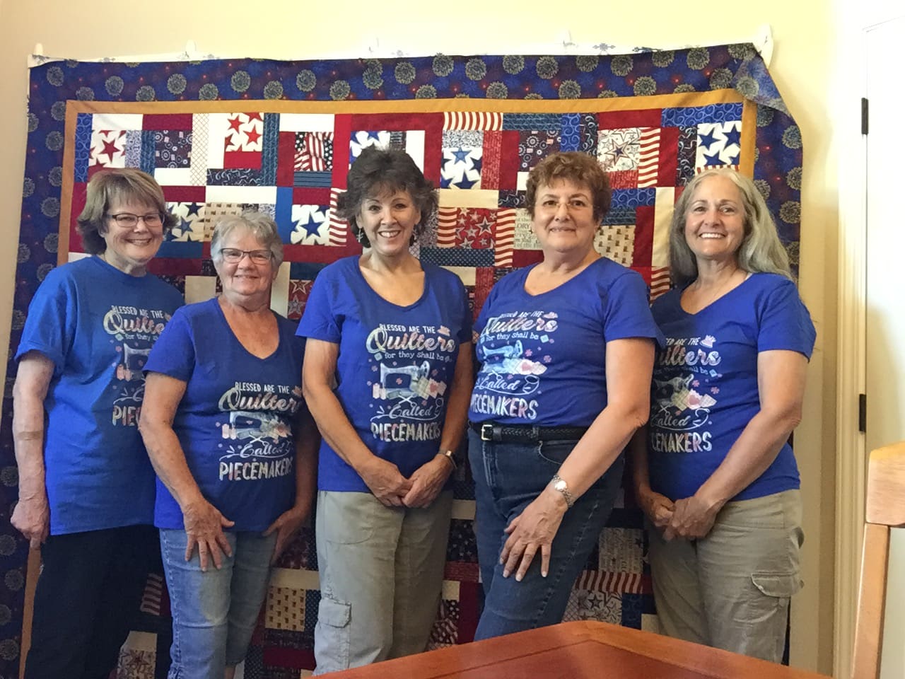 Piecemakers with their new T-shirts in front of the Quilt of Valor top.