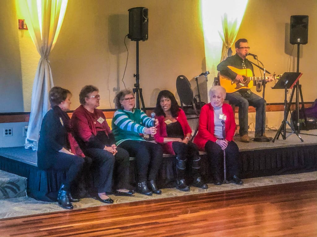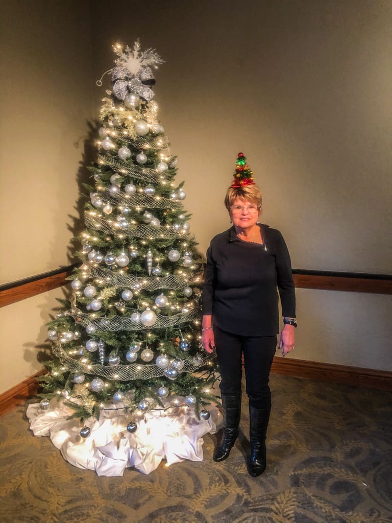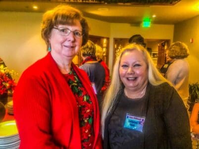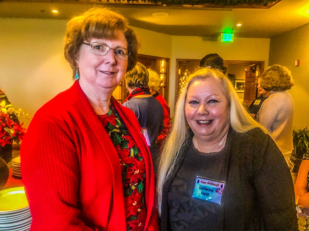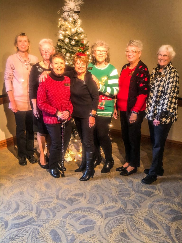 72 EPWC members and guests filled the ballroom at the Rogue Valley Country Club for our December luncheon. The room was a literal sea of red clothing as everyone brightened the cold, foggy day. We all enjoyed some social time, the usual business meeting and a scrumptious buffet lunch. The menu included scalloped potatoes, roast turkey, tossed salad, roasted brussels sprouts, fresh fruit and a tangy lemon bar. Each table featured a hand-crafted centerpiece crafted by member, Annette Godfrey, which were distributed to lucky members through a drawing. We celebrated December and January birthdays and welcomed new members and guests. The program featured local musician, John Hollis, who entertained us with a few jokes and vocal and guitar Christmas music. A group of 5 ladies moved up to a corner of the stage to add a female chorus to the music. Lots of happy holiday wishes were shared as we prepared to finish the rest of our day. Happy Holidays to all and looking forward to an outstanding 2020 together.