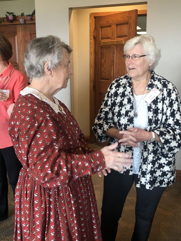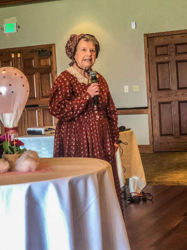 76 women gathered at the Rogue Valley Country Club on a sunny winter day to enjoy good company, wonderful food and a fascinating program. Leta Lovelace Neiderheiser, author of "Jesse Applegate: A Dialogue with Destiny" was our speaker who played the role of Cynthia Applegate, wife of Jesse Applegate. Leta is a great, great granddaughter of Jesse Applegate and she has done extensive research on the life of Jesse and his family and their trip from Missouri to Oregon on the Oregon Trail in the 1840's. Jesse led the wagon train and is an important figure in Oregon history for developing the Applegate Trail and many other accomplishments. The stories were spellbinding and everyone learned some Oregon history that they didn't know. Leta's book is available at the library and also on Amazon. We welcomed two new members to the group who were attending the luncheon as guests: Teresa Allen and Sofie Goncalves. It is hard to go wrong with a lunch buffet featuring chicken picata, lemon risotto, roasted asparagus, garden salad, fresh fruit and chocolate mousse. Birthdays were celebrated and the amazing hot air balloon centerpieces shared with members through a drawing. Lots of activities to sign up for and friends to catch up with. Thanks to Annette Godfrey for the centerpieces, Trudi Eyraud for the program and Maxine Williams for coordinating the luncheon. See you in April.