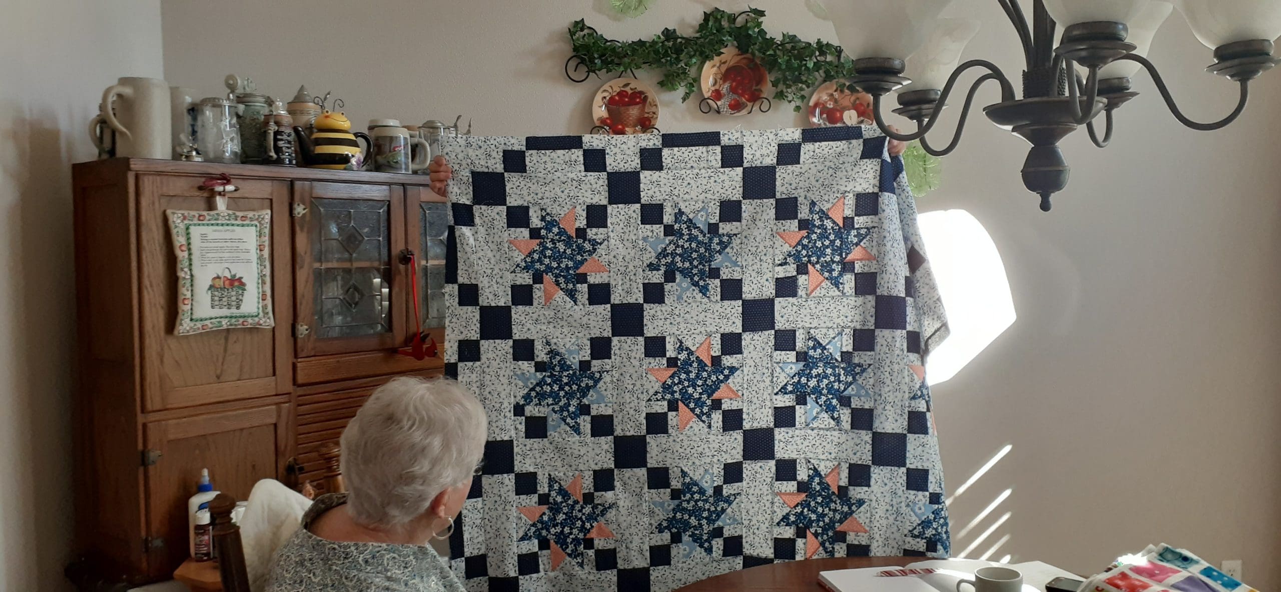 Dora Moore shared her quilt top she is making for her granddaughter. Helen shared a quilt she made and had quilted with her quilting group in Idaho. Also shared the quilt she is making for the Mountain Stars Quilt Guild quilt show this year.