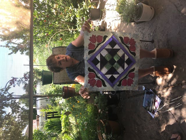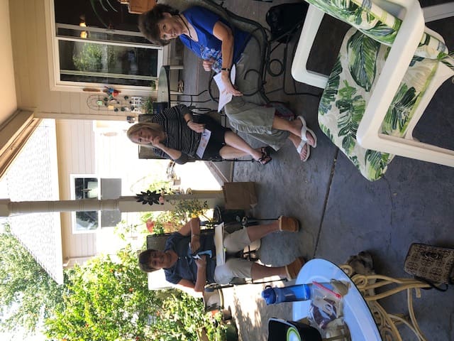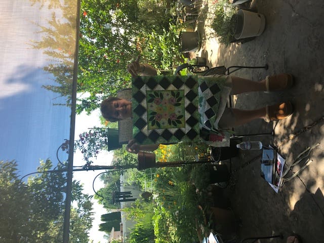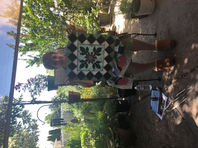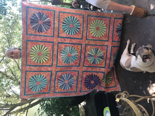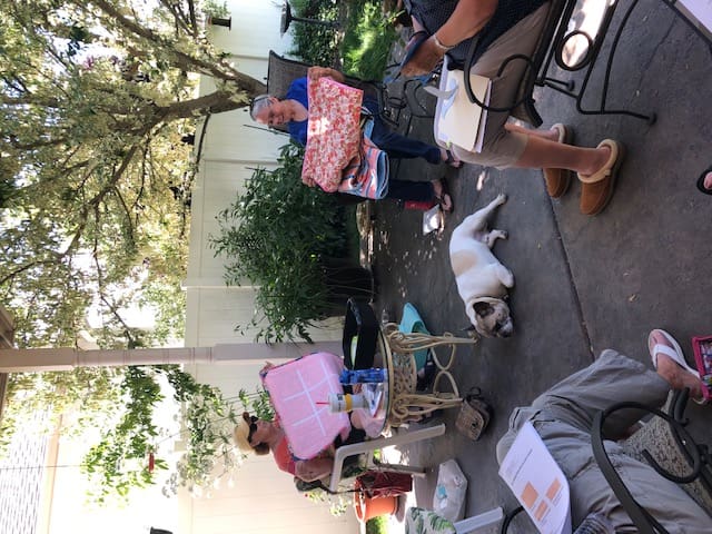 On June 3, 2020, the Piecemakers enjoyed a wonderful time on Rosenelle’s shady patio enjoying the view of her amazing garden. What a setting! Rosenelle’s dog kept us company (and got into some of the pictures). We love Bo.