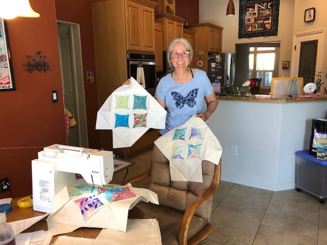 The masked Piecemakers met at Rosenelle's on July 1 for a lesson on how to make a Cathedral Window Quilt block. Rosenelle was our instructor extraordinaire. She worked very hard to make it easy for us to socially distance ourselves and we wore our masks when appropriate. As always, we had a few show & tell's. Linda shared some of the masks she has made, some for kids and one with a clear panel over the mouth area for lip reading. Rosenelle & Linda shared their latest embroidery class projects. These were just stunning.