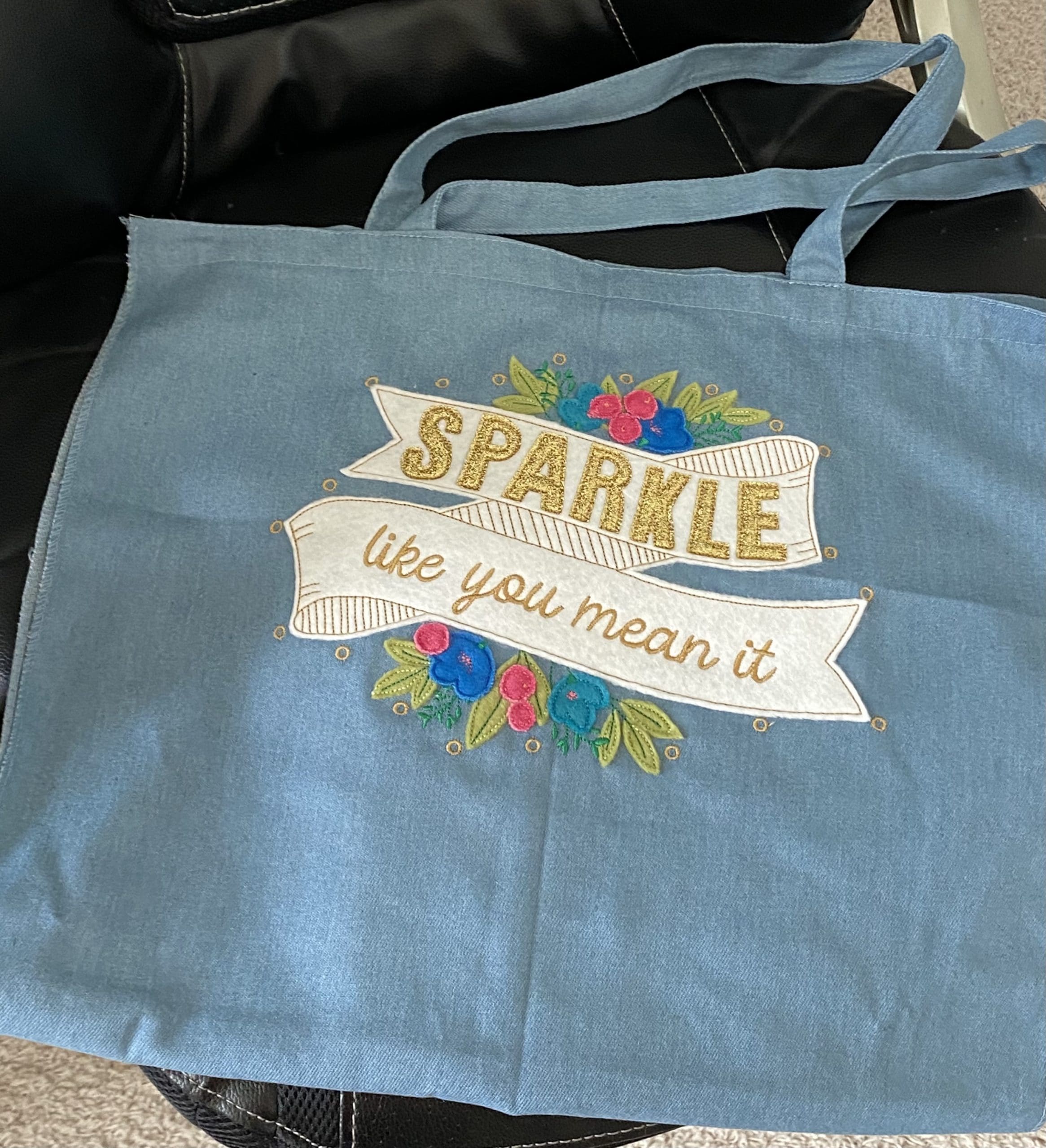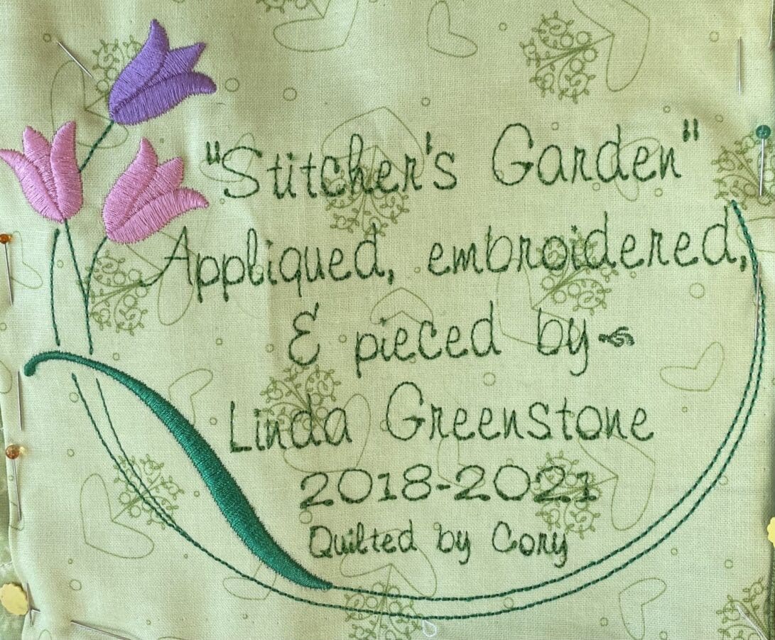 Linda shared a couple of her beautiful embroidery projects and also the adorable label she made for “Stitchers Garden” quilt. Labeling your quilts is always a good idea. Check out the pictures.