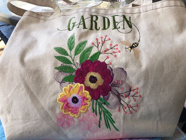 For show & tell, Kelly showed up with her daughter and they shared the quilt Kelly had made & machine quilted for one of her daughter's friends. Kelly also showed off some more quilts she made & quilted on her new long arm. She is really getting very good at this! Kelly brought the quilt of valor we started making together in March. It just needs borders. Linda made some adorable carrot bags to put Easter treats in. So cute! Elaine made a spring trivet to compliment her spring table runner. Rosenelle showed us her latest garden themed bag. The embroidery is just gorgeous.
