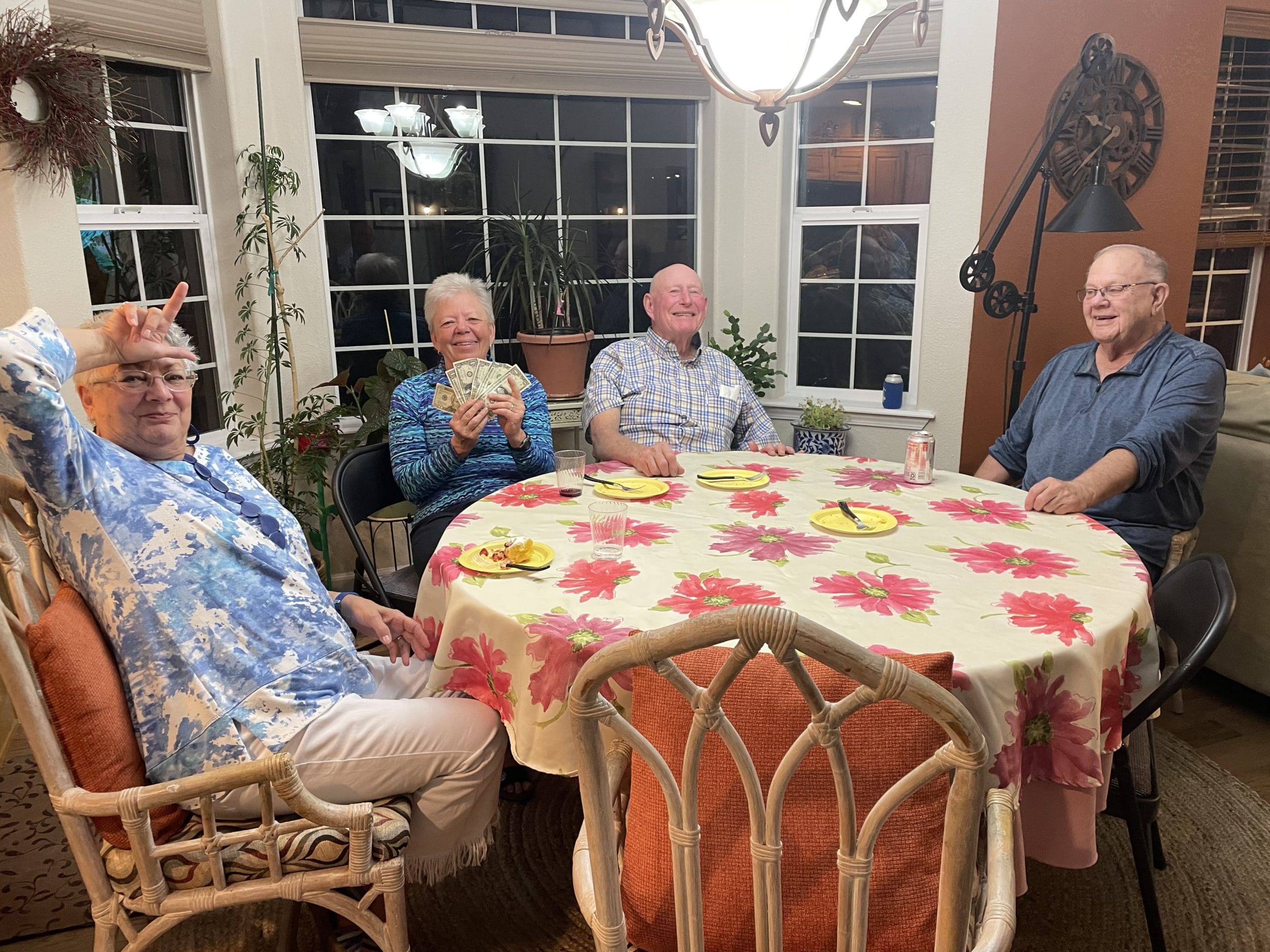 Due to the re-emergence of a couple cases of Covid 19, Couples 313 Potluck was held in only 2 homes on May 21st – Sharyn Close and new member Kay Breithaupt. The groups were on the smaller side but the visiting, food and fun card game were just as enjoyable as always. The ladies came away as winners at Kay’s house with Ruth Jenks score of 36 points beating everyone else. Aleli Lawson, Debbie Mastroianni and Connie Quiring rounded out the low scores and Al Mastroianni’s score of 216 gave him biggest loser honors. Over at Sharyn’s Viki Brown scored a low of 43 points followed by Roger Nichols, Paul Erickson and Brigitte Lemmerman with Maxine Williams final tally of 232 making her the biggest loser. Here’s hoping everyone is healthy for the June 18th gatherings which will be hosted by Connie Quiring, Annette Godfrey and Michelle Harter. If you are interested in joining the Couples 313 group, please contact Aleli Lawson.