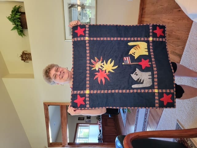 The Knotty Ladies met at Lydia Davidson's home on July 6, 2022 at 1:00 pm for their regular meeting. Four ladies attended: Lydia Davidson, Dora Moore, Bonnie Scriba and Debbie Hart. It was good to see everybody and their new projects. Lydia completed a beautiful American Flag Quilt. She placed the names of the 50 states where the 50 stars would appear on a regular flag. Bonnie is working on a gorgeous Pinwheel quilt that she will donate and made a beautiful Stars and Stripes hanging. Dora completed 2 very cute wall hangings that will go in the Mountain Stars Quilt Show at the Medford Armory on July 22-23 from 10:00 am to 4:00 pm. Debbie is working on a quilt to donate to the Quilts of Valor.