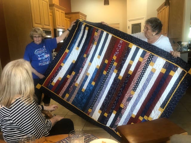 Rosenelle hosted our meeting in October. She gave us a lesson on how to make a mile a minute quilt. This is a fun and easy kind of quilt. It is a scrappy quilt and a great way to use up small pieces of scraps as well as strips. We also had a show and tell. The QOV is finished and we all had a hand in working on it. The whole group started making the strips. Then Kelly finished them. Sue did the border. Kelly machine quilted it on her long arm and Linda did the binding. It turned out great!