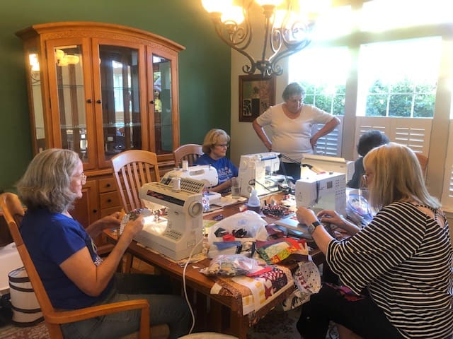 Rosenelle hosted our meeting in October. She gave us a lesson on how to make a mile a minute quilt. This is a fun and easy kind of quilt. It is a scrappy quilt and a great way to use up small pieces of scraps as well as strips. We also had a show and tell. The QOV is finished and we all had a hand in working on it. The whole group started making the strips. Then Kelly finished them. Sue did the border. Kelly machine quilted it on her long arm and Linda did the binding. It turned out great!