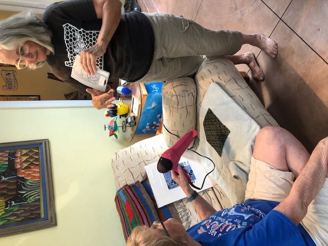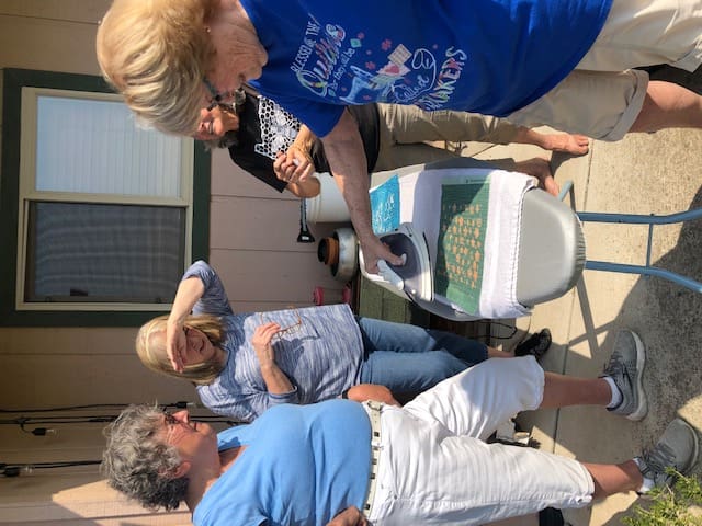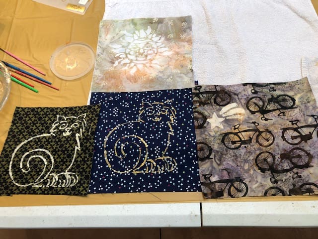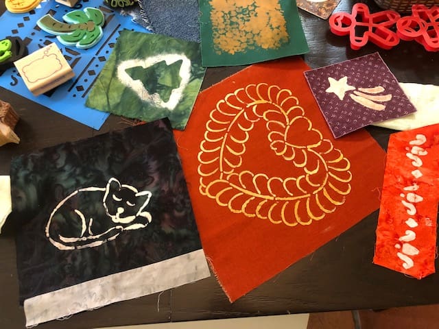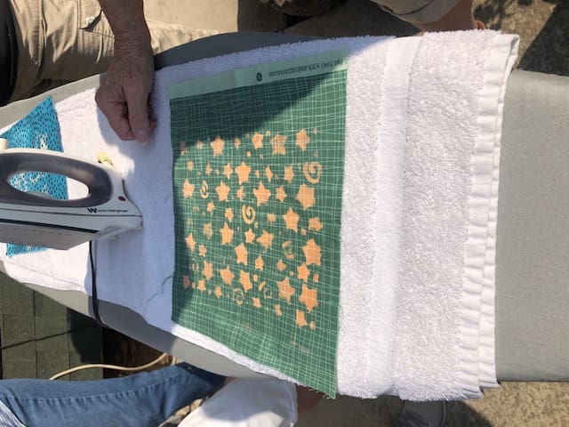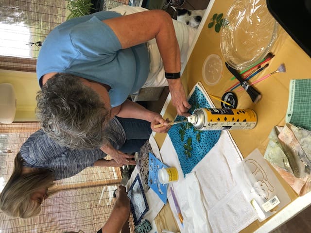 In September the Piecemakers got together at Kelly's home to learn how to do color discharging. Using a temporary adhesive, we sprayed around templates on the fabric to remove the color in the template pattern. Rosenelle tried it with leaves from the yard. It was quite amazing to see what color the fabric turned after the application of the adhesive. Check out the pictures to see what I mean!