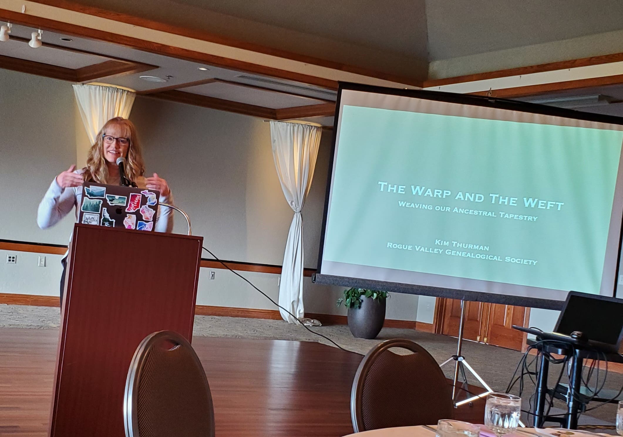 Kim Thurman, an independent genealogy writer, researcher and past president of Rogue Valley Genealogical Society, was our guest speaker. Inspired by her own family's interesting history, Kim took us through the journey of finding her roots. We traveled back to the Civil war, World War II and to the prison escape of one of her more shady relatives. Kim is extremely passionate about her second life's career and this enthusiasm spilled over into her talk.