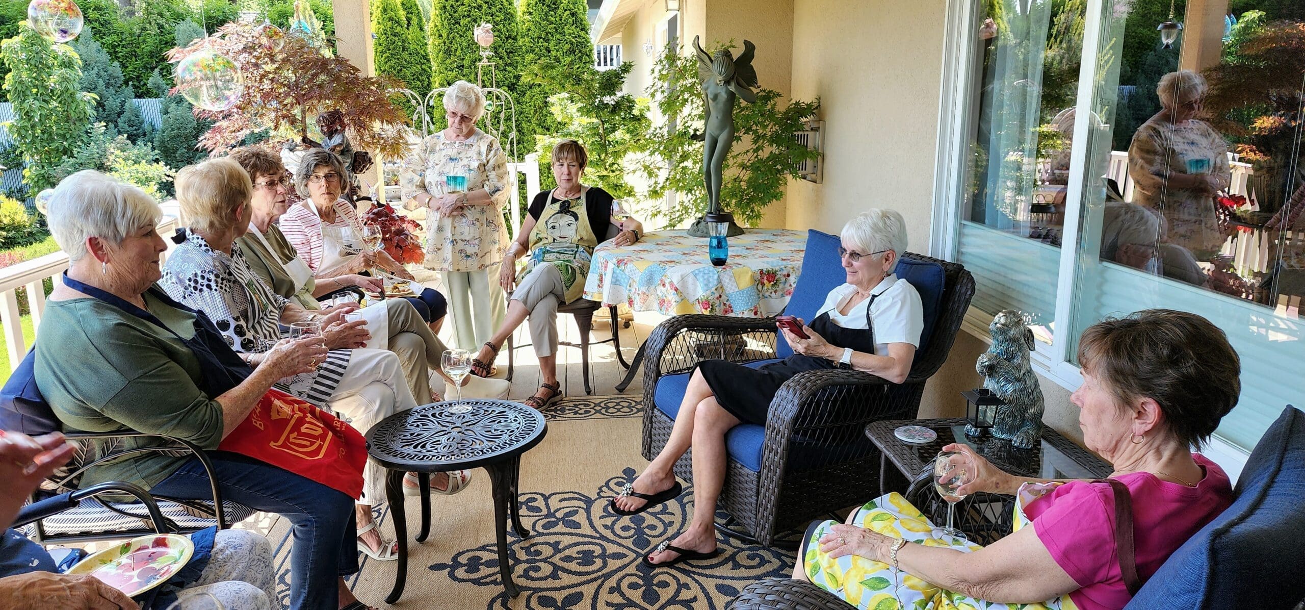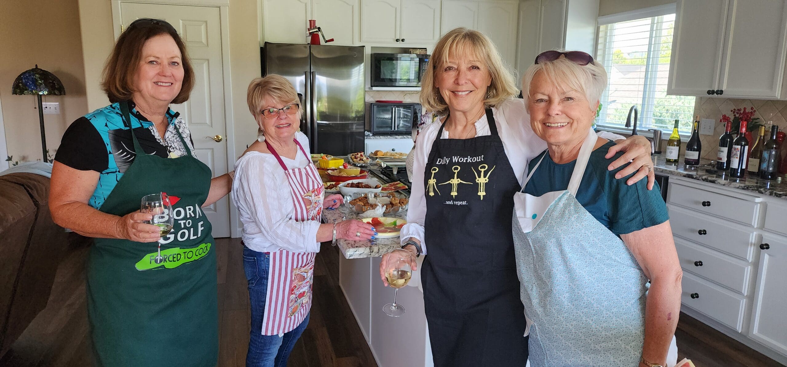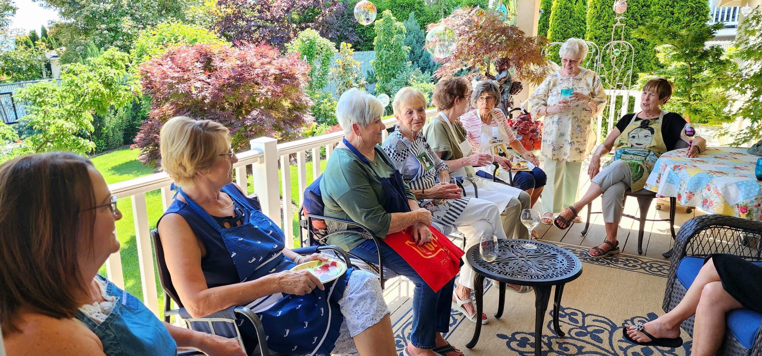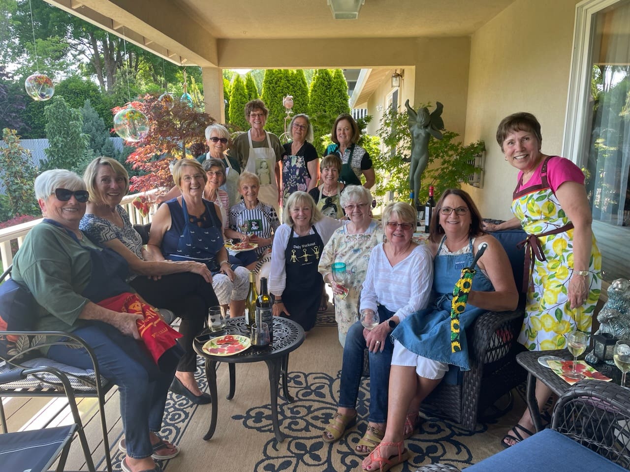 Sip & Dip met in May at the home of Virginia Felker. Perfect mid 80’s weather and a slight breeze off the garden made for a delightful afternoon. We had great food, company and lots of laughs. The theme for May was Aprons. What an assortment of colors, designs and humor. Much hilarity over some with more flair than others. You’ll have to ask one of the attendees where our greatest laughs came from. No photo evidence posted here!