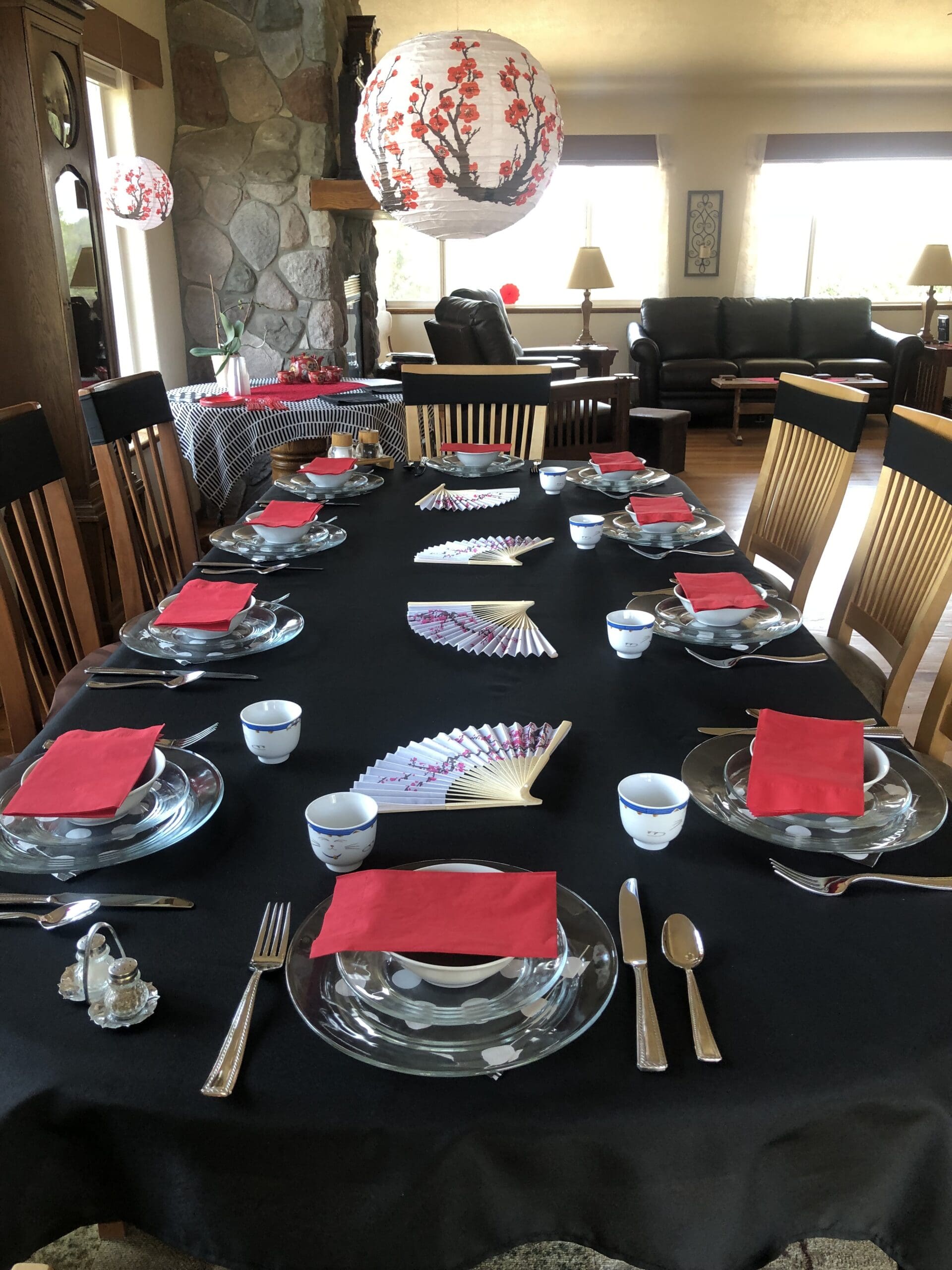Ten ladies gathered at the home of Viki Brown to explore the cuisine of Korea at the July Culinary Arts luncheon. Each of the group prepared a dish from a pre-assigned recipe to create a full menu. Lots of hot peppers, sesame oil and garlic in this food which made it spicy and very flavorful. Fire chicken, fermented soybean paste stew, garlicky bean sprouts and pan fried marinated eggplant are examples of the recipes. Lots of cold beverages helped cool down our palates. Some mango sorbet and fresh fruit rounded out the meal as dessert. Thanks to Sharyn Close who served as co- host and all the guest chefs. The photo shows our beautiful dining table setting.