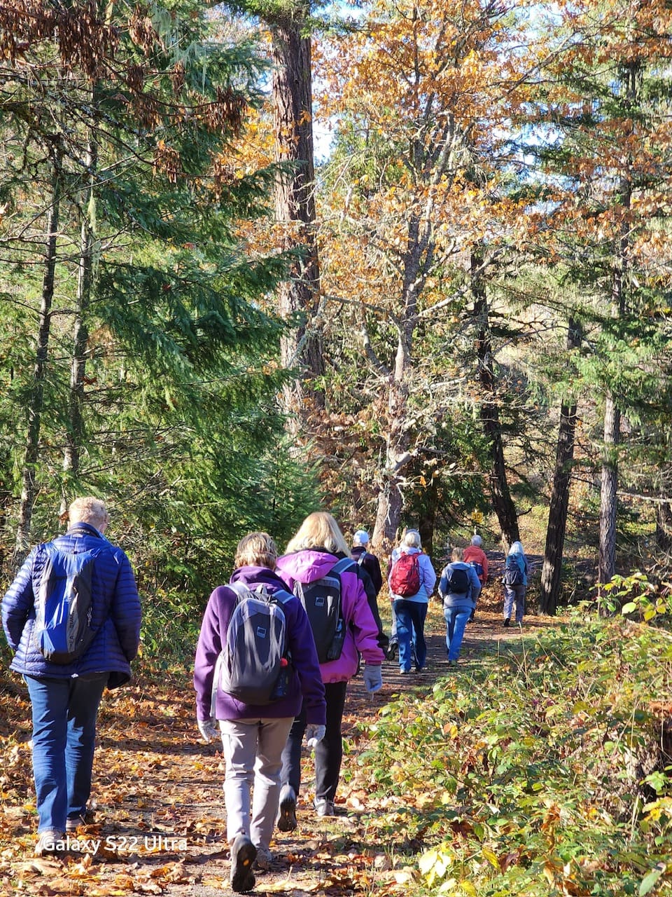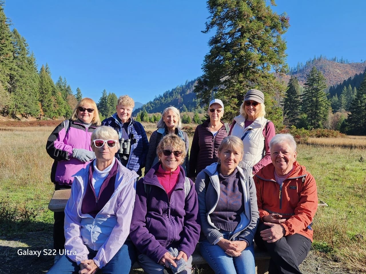 9 members and a guest hit the Elk Creek Trail on a glorious day and enjoyed the fall color, fresh air, good company and exercise. Part of the group completed 4 miles and the rest of the group hiked 7.5 miles. The longer group gathered on an old cabin foundation to sit and eat lunch before turning back to the trailhead. Lots of solitude and a clear, blue sky added to the experience. The land around the trail is “open range”, so we had some friendly cows resting in a field near our lunch stop. Thanks to Lori Miles for the great photos and to Kate Coggin for organizing and leading the hike.