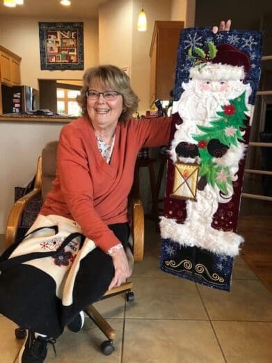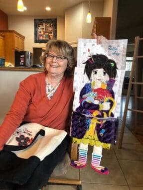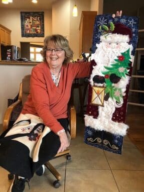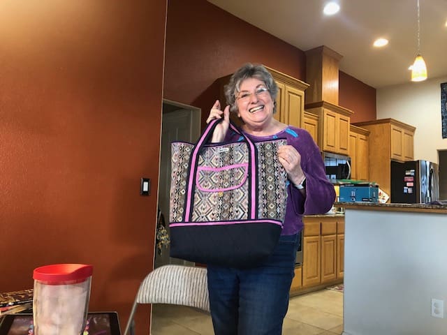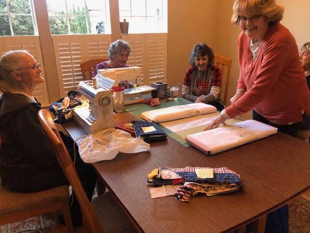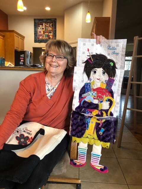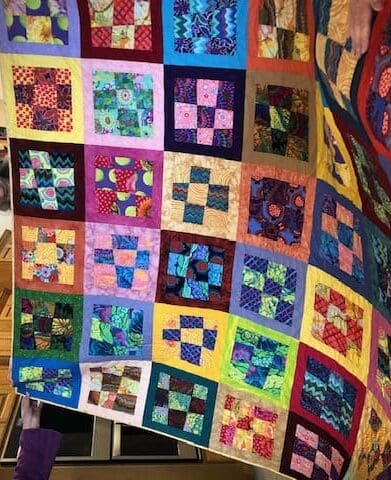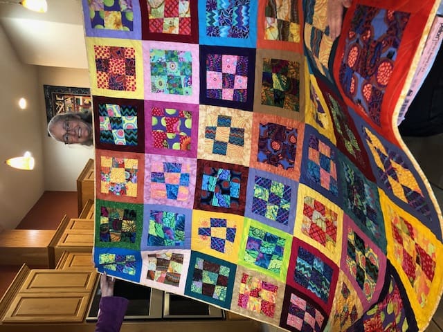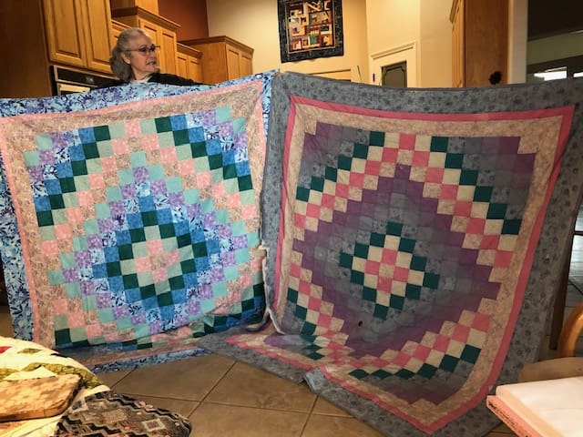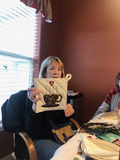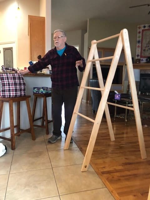 On February 7th the Piecemakers enjoyed another fun meeting at Rosenelle's home. We started with a guest, Bill Sproat. Bill wanted to demonstrate the beautiful wood quilt ladders he makes & sells. He does beautiful work. Next we shared a lot of show & tells. Kelly shared a story about her daughter asking her if she could repair a quilt Kelly had made for her in 1994. Her daughter has big dogs and they love the quilt. Kelly thought a new quilt in the same pattern would be much better. Enjoy the before and after picture. Kelly also showed off a gorgeous wonky nine patch. Linda has been been having lots of fun with embroidery work. Rosenelle has a new bag with lots of pockets and Sue has made a bunch of hot pads. After a quick snack, some in the group worked on a QOV that we started a few months ago.