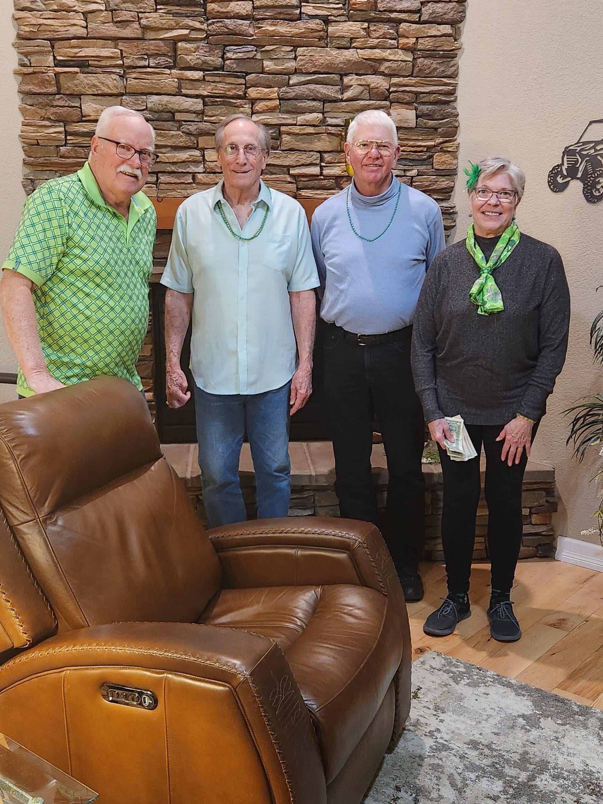 Vicki and Steve Wittenbrock hosted a great group of couples for an evening of food, card playing and socializing. Everyone took advantage of the St. Patrick's Day theme to break out their favorite green shirts and special accessories. Winners for the card game were: Steve Wittenbrock (1st), Paul Erickson (2nd), Barbara Weber (3rd) and Jack Westrum (4th). Thanks to the Wittenbrock's for hosting.