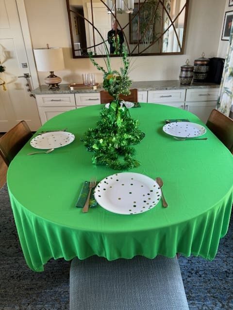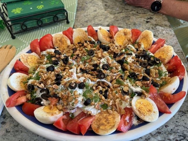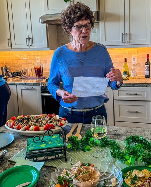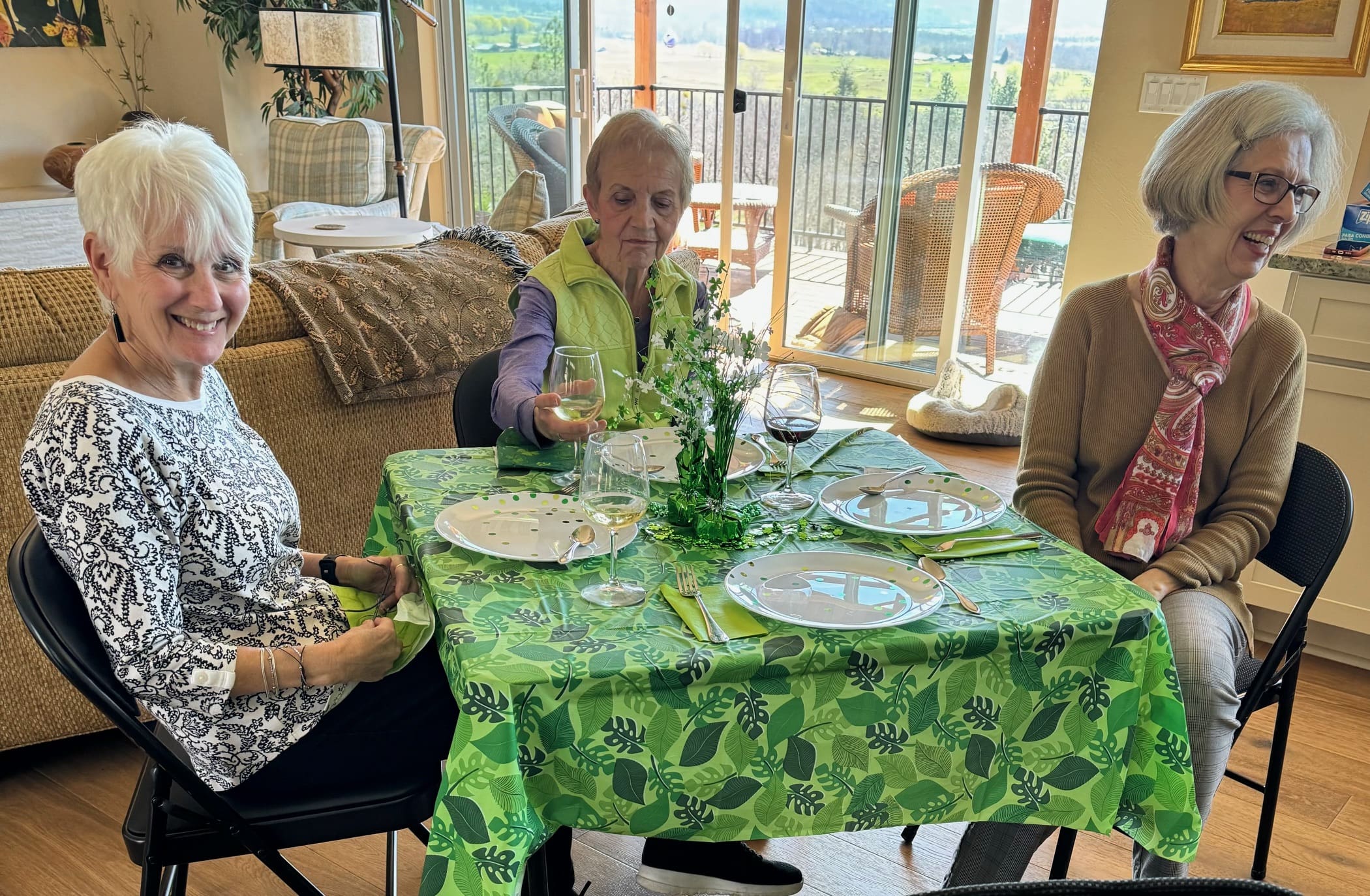 Twelve members gathered at the home of Ruth Jenks this week for a vegetarian lunch created from recipes in the original Moosewood Cookbook. Sharyn Close served as co-host and together she and Ruth brightened the dining tables and kitchen with festive St. Patrick’s Day decorations, dishes and napkins. A menu of 10 recipes was created by Ruth and Sharyn from the selected cookbook and each guest prepared and brought her dish to share with the group. The original Moosewood Cookbook was published in 1973 and was hand-written and illustrated by author Mollie Katzen. The recipes came from the Moosewood Restaurant in Ithaca, New York which highlighted vegetarian dishes with an international flair. Each guest discussed her recipe and highlighted preparation of ingredients and any challenges encountered. Each dish was flavorful, interesting and satisfying. A few examples are: Cauliflower Cheese Pie with Shredded Potato Crust, Balkan Cucumber Salad, Gypsy Soup and Baba Ganouj (eggplant dip). A big thank you to Ruth and Sharyn and all the guest cooks. We meet next in May with a menu from “Once Upon a Chef”.