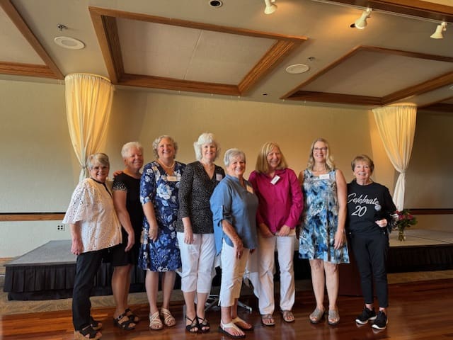 The EPWC Board of Directors was introduced to the members and guests assembled at the 20th anniversary luncheon held at RVCC on June 18, 2025. From left to right: Sharyn Close, activity group coordinator, Viki Brown, website and online services coordinator, Becky Newell, luncheon program coordinator, Mary Harper, luncheon coordinator, Sandi Smith, membership coordinator, Ruth Jenks, treasurer, Denise Fikes, secretary, Liz Crossman, president. Welcome to all and thanks for your service on the Board.