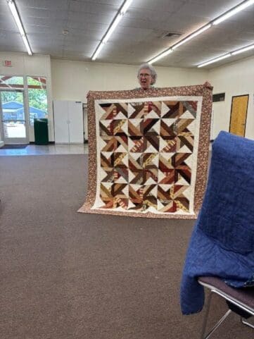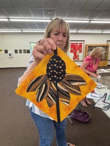 At our August meeting, Kelly showed us how to use discharge paste to make an interesting block. Making circles is so much easier this way than sewing them! It was really interesting to see how the color changed as it was removed from the parts of the fabric that had the paste on it. This was a repeat project and our newest members really enjoyed it. Rosenelle brought in a couple of her "UFO" projects and several members had show and tell items to share with us. I just love show and tell!