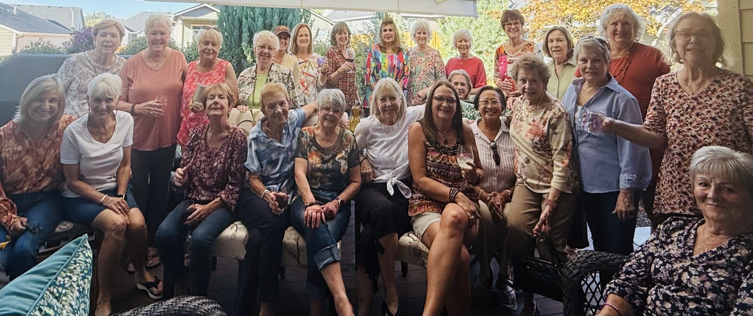 The theme for this month was "fall casual" clothing and although the temperature rose to the mid- 80's, some fall colors showed up. 30 members shared wine, appetizers and joyful social time together at the beautiful home of Terry Jordan. A big thanks to Terry for hosting and to all who continue to participate each month. Next month will be your chance to break out the Halloween-themed clothing or costumes for a spooktacular gathering at the home of Kris Howard. Thanks to Brigitte Lemmerman for the photo and for coordination of the group.