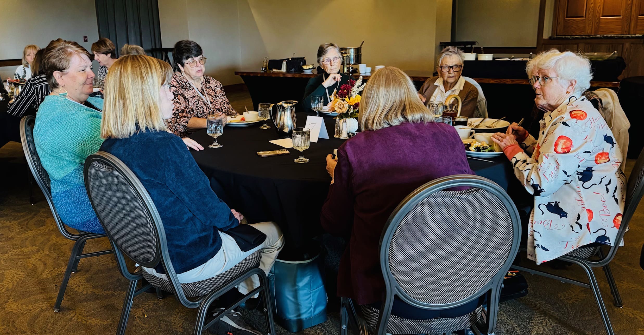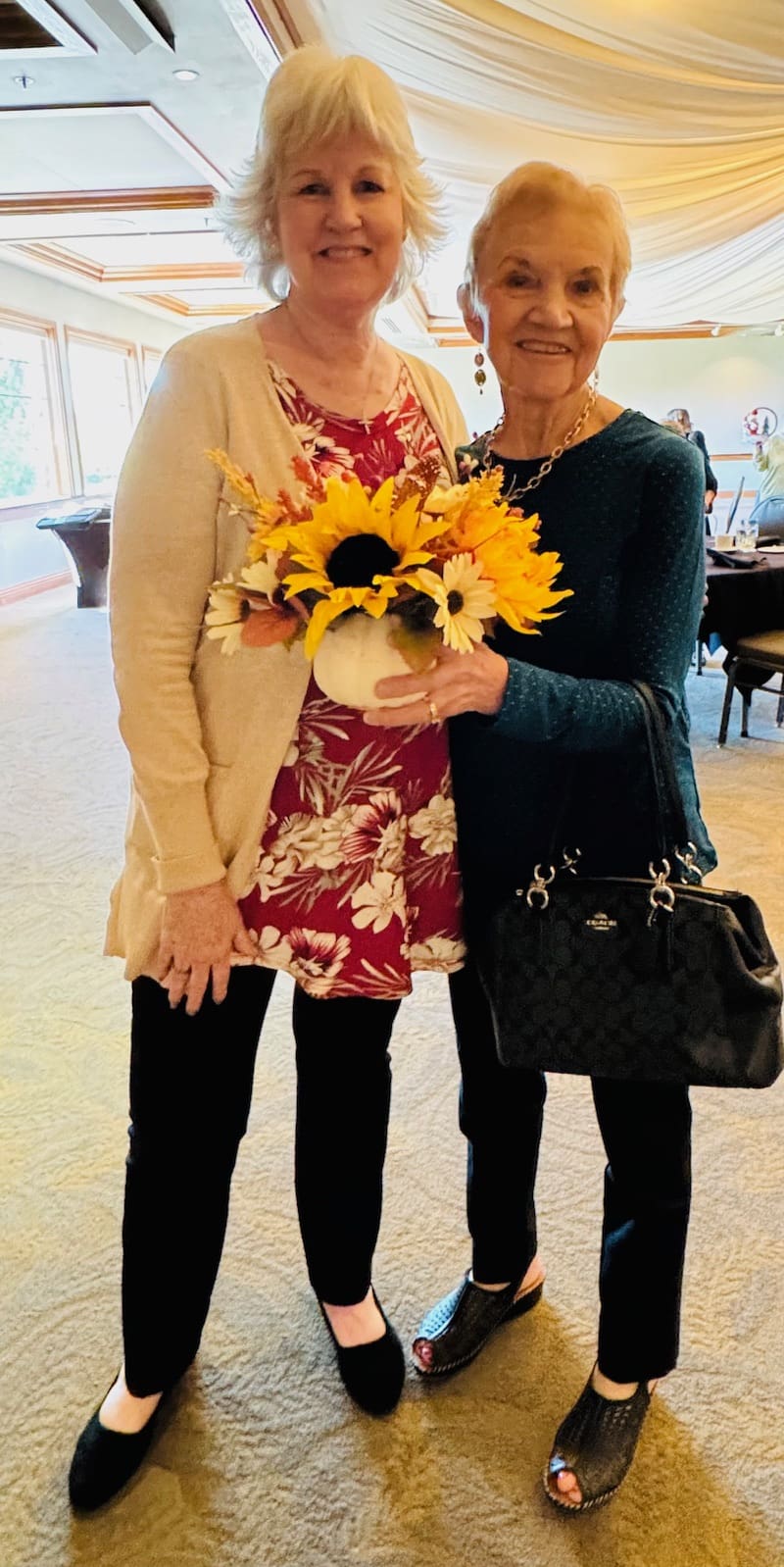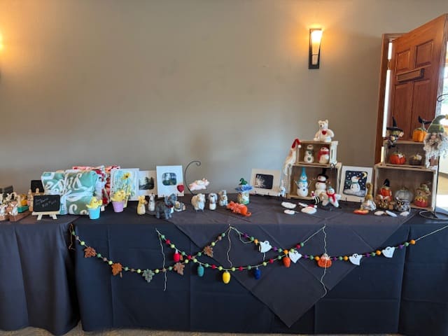 We have some talented artisans in the EPWC and the October luncheon gave them an opportunity to display and sell their wares. From Diamond dot pictures, needle felted wool creations, jewelry, handcrafted greeting cards, Alpaca wool knitted headware, handwoven items and photography, there was something for every taste. It was a great time for some early holiday shopping. As always, the dining tables were adorned with beautiful fall-themed centerpieces designed by Mary Harper and assembled by the centerpiece committee members. Members of the Board provided updates on Club business and upcoming member birthdays were celebrated. A buffet lunch was followed by a piece of wonderful birthday cake graciously provided by Jeanne Wallace. Thanks to Mary Harper for all of her efforts in coordinating the many details involved in staging a luncheon. Thanks to all the guests who attended and made it a successful market for the vendors. There will not be a luncheon in December, but there will be a special Sip and Dip event open to all Club members. We’ll be back at the Rogue Valley Country Club in February for the next luncheon.