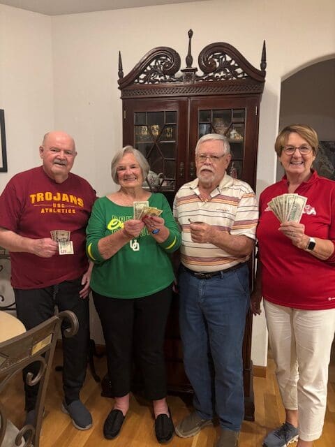 One of the Couples 313 potluck parties in October was hosted at the home of Lynn Baker and Jim Hyden. They chose a tailgating theme for the potluck and encouraged guests to wear shirts with the logo or name of their favorite sports team. It was a fun evening for all. Winners in the card game included Lynn Baker, Jim Hyden, Susan Smith and Bill Sproat. Thanks to the hosts for their hospitality.